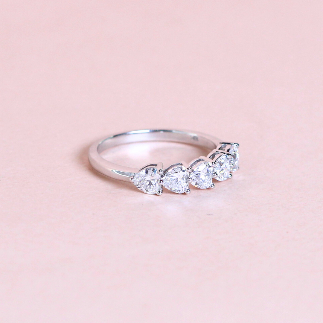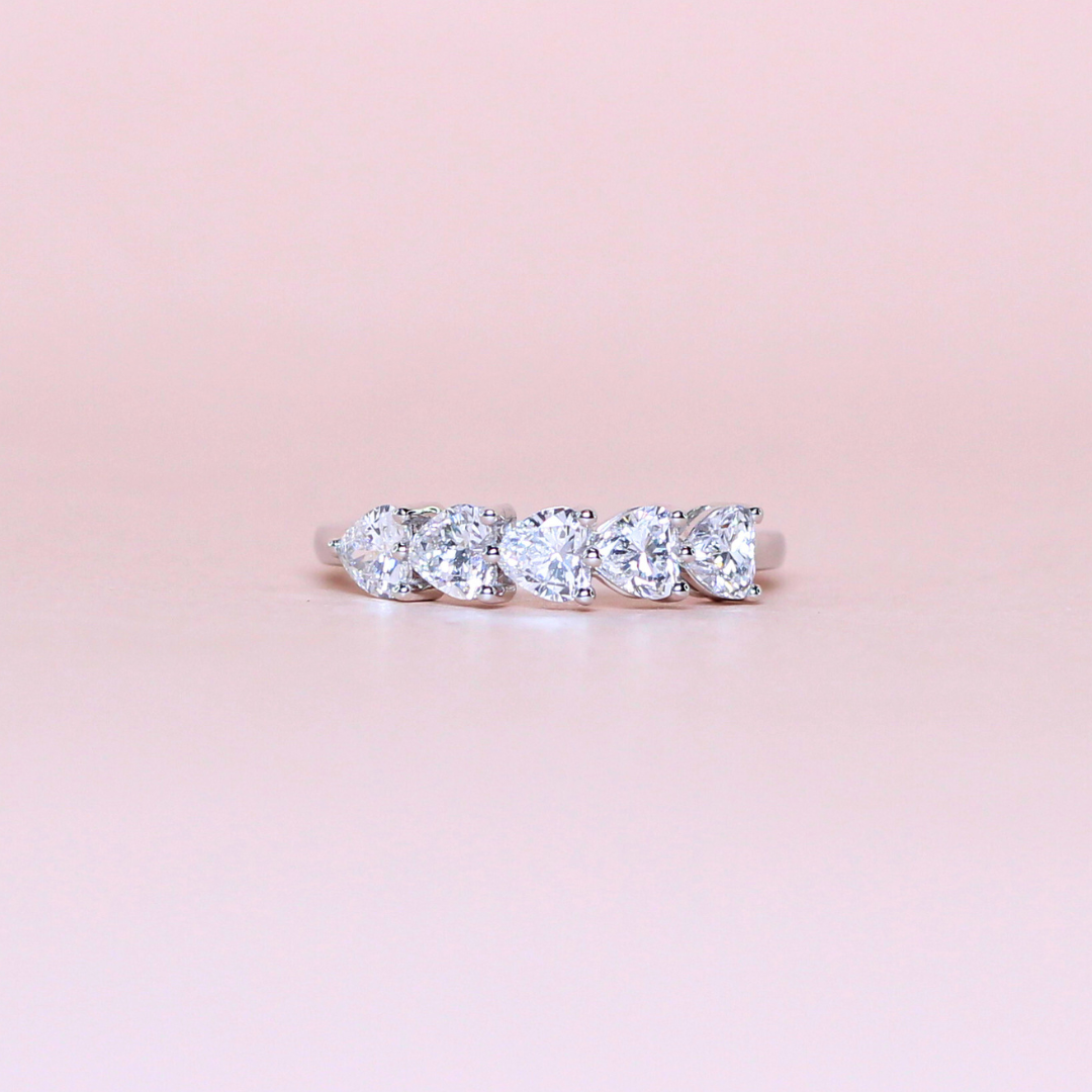 Featuring five delicately cut heart-shaped diamonds, each stone symbolizes a chapter in your unique story—from the first glance to forever. Set in a sleek band, this piece blends modern elegance with romantic charm, making it a meaningful choice for anniversaries, milestones, or everyday wear. Crafted with sustainable lab-grown diamonds, it’s a timeless expression of love with a conscious touch.