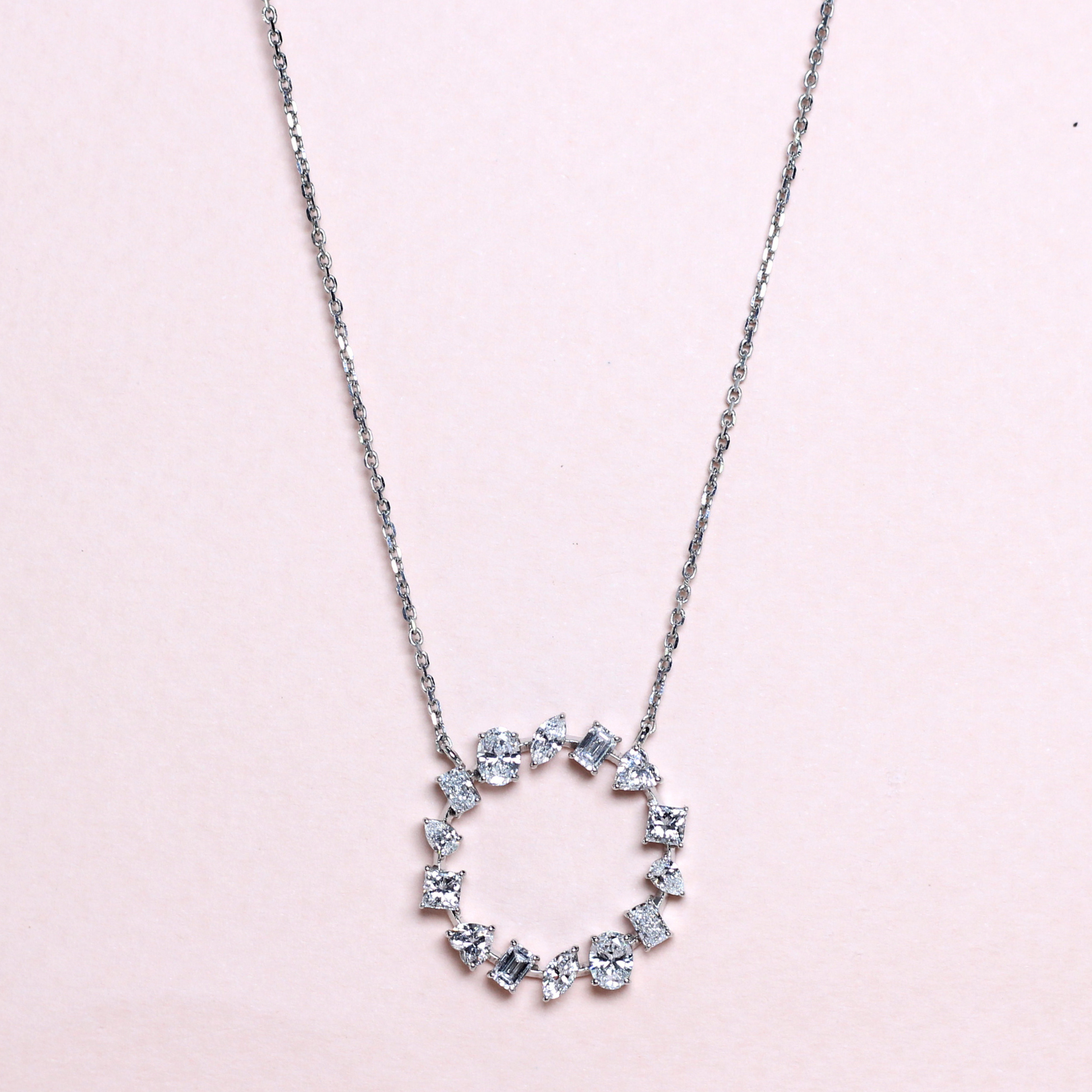 This 1.252cts multi shape lab grown diamond necklace brings together a refined mix of cuts that flow effortlessly along the neckline. Each stone is thoughtfully placed to create a subtle rhythm of light and form, offering a contemporary yet graceful expression. The design balances precision and softness, making it a quietly striking piece that complements both modern and classic styles.