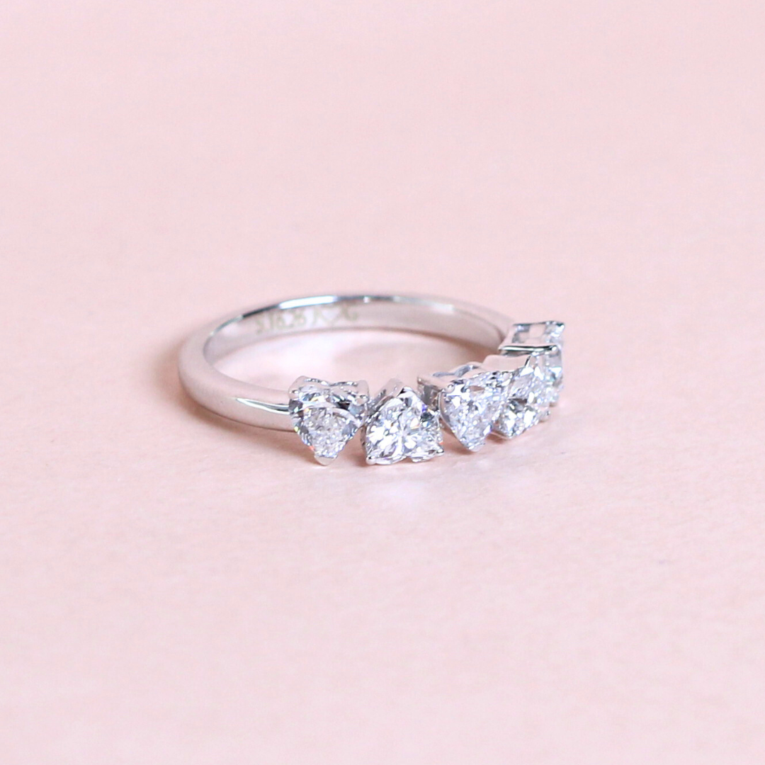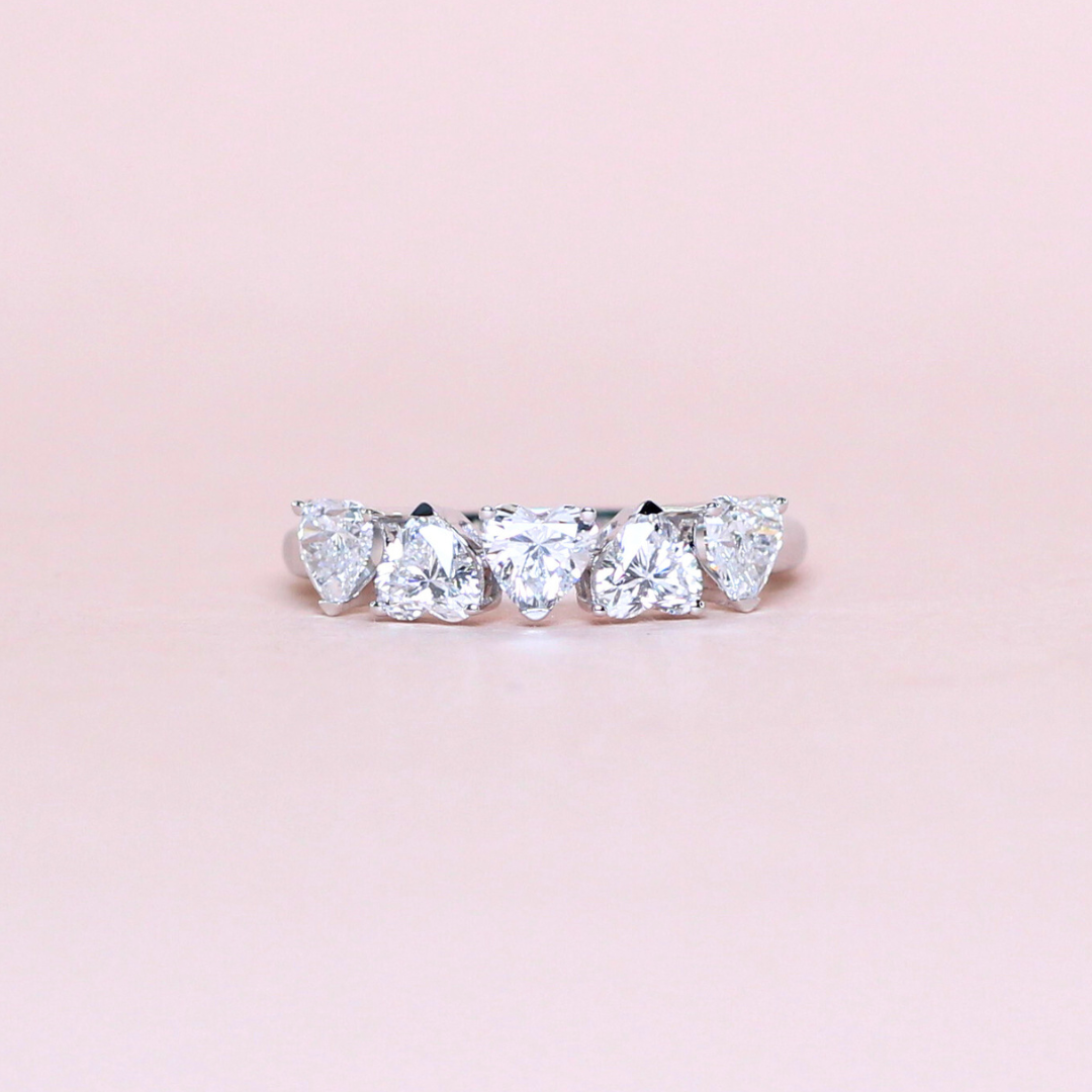 A romantic take on a classic style. This 1.25ct five-stone ring features heart cut lab-grown diamonds, beautifully aligned to symbolize love, connection, and lasting commitment.