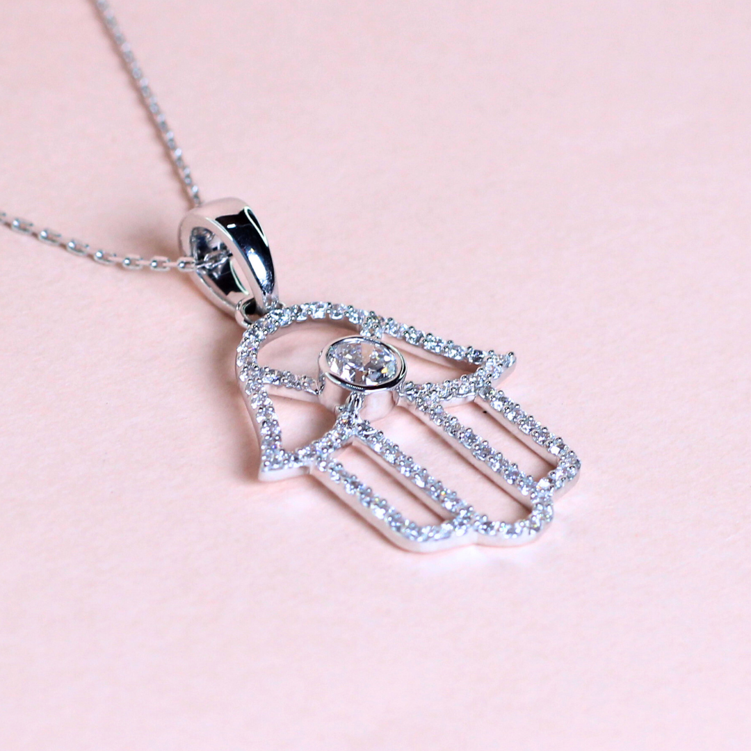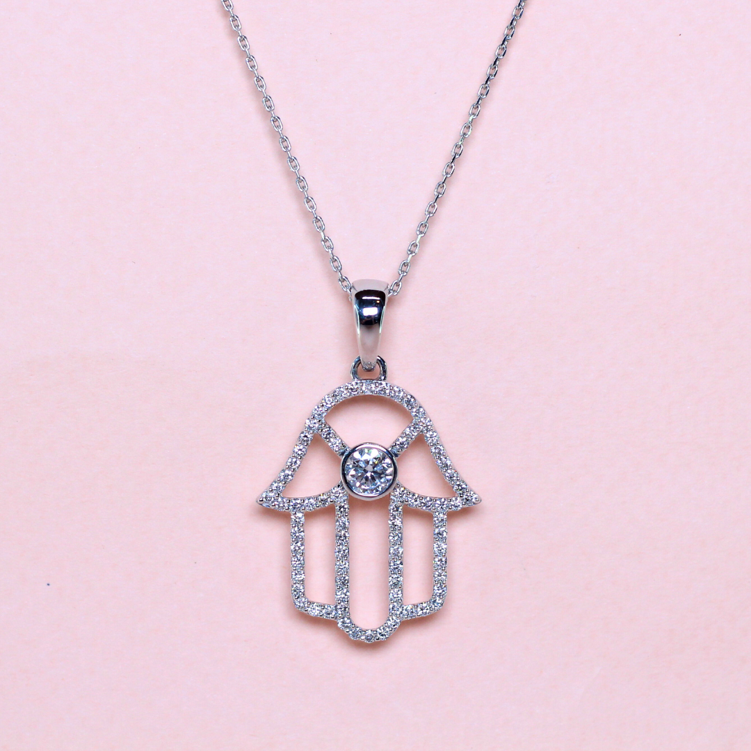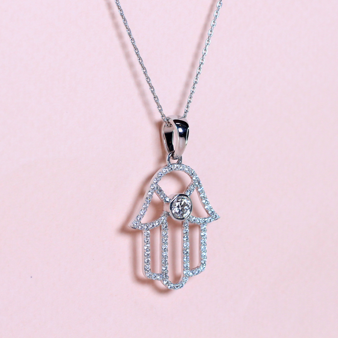 A symbol of protection and positivity, this elegant Hamsa hand necklace features 1.519 carats of lab-grown diamonds, intricately set to highlight its graceful silhouette. The shimmering stones bring depth and brilliance to the design, making it both a meaningful talisman and a stunning statement piece. Perfect for layering or wearing solo, it’s a refined blend of spiritual charm and modern sophistication.
