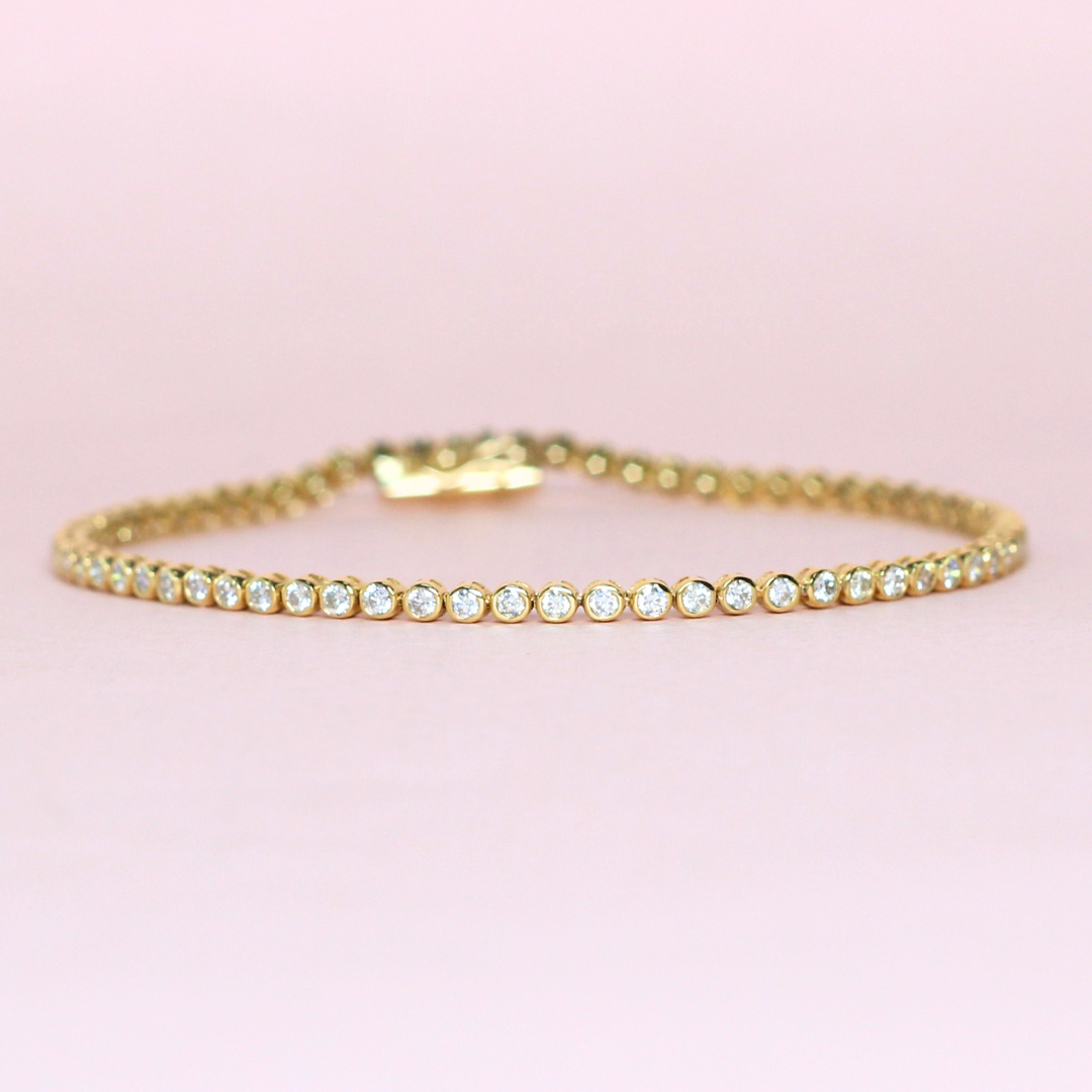 Modern elegance meets timeless design in this 1.60-carat Round Cut Bezel Tennis Bracelet. Each diamond is individually secured in a sleek bezel setting, creating a seamless row of brilliance with a contemporary twist.