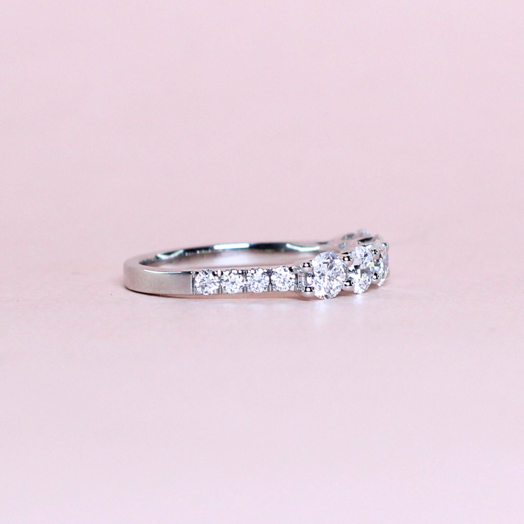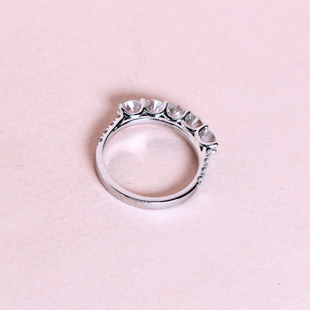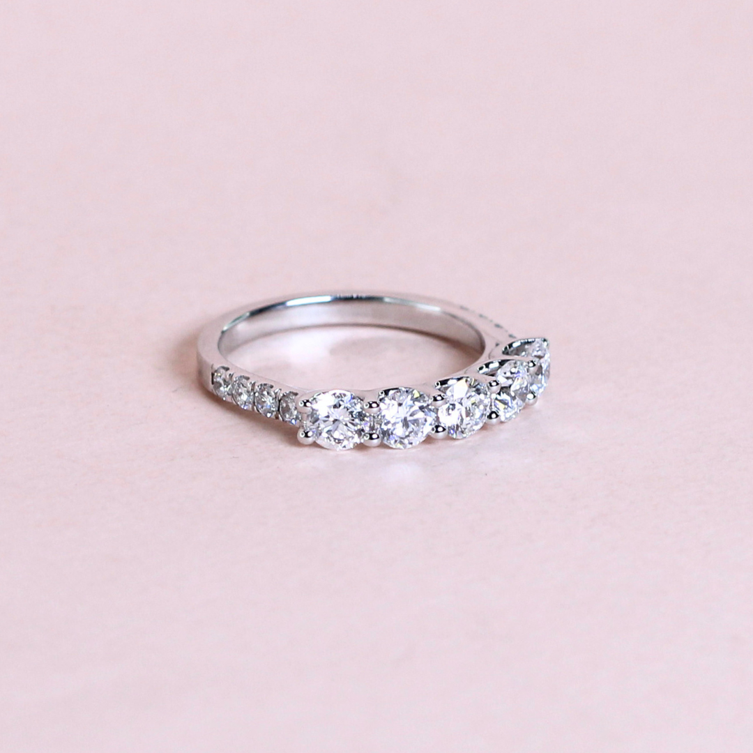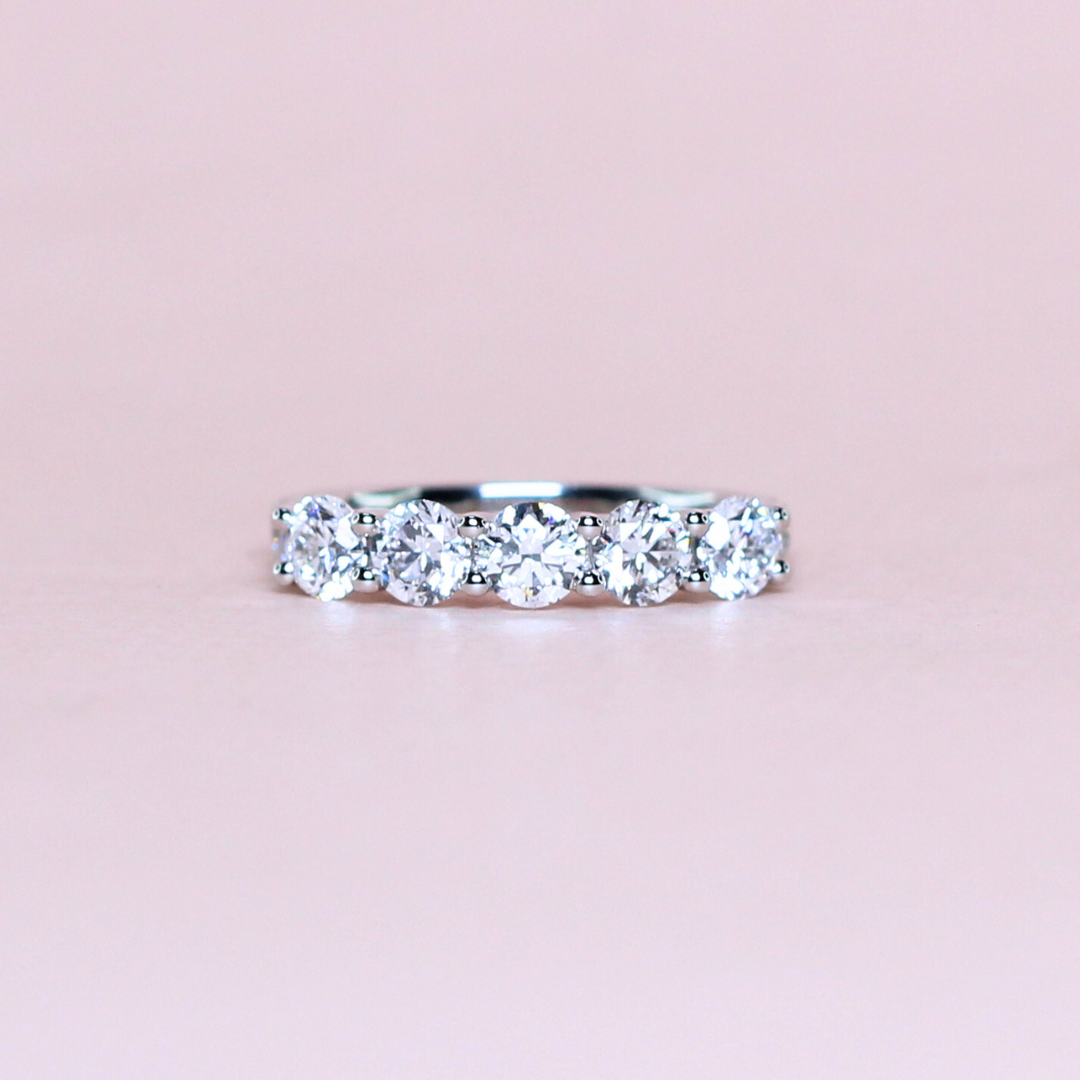 This 1.62 carat 5-stone round cut lab-grown diamond ring is set on a delicate half eternity pavé band, adding brilliance at every angle. Each diamond represents a cherished milestone, making it a meaningful symbol of love and commitment. Crafted in sleek elegance, this ring beautifully balances sophistication and sparkle—perfect for celebrating life’s unforgettable moments.