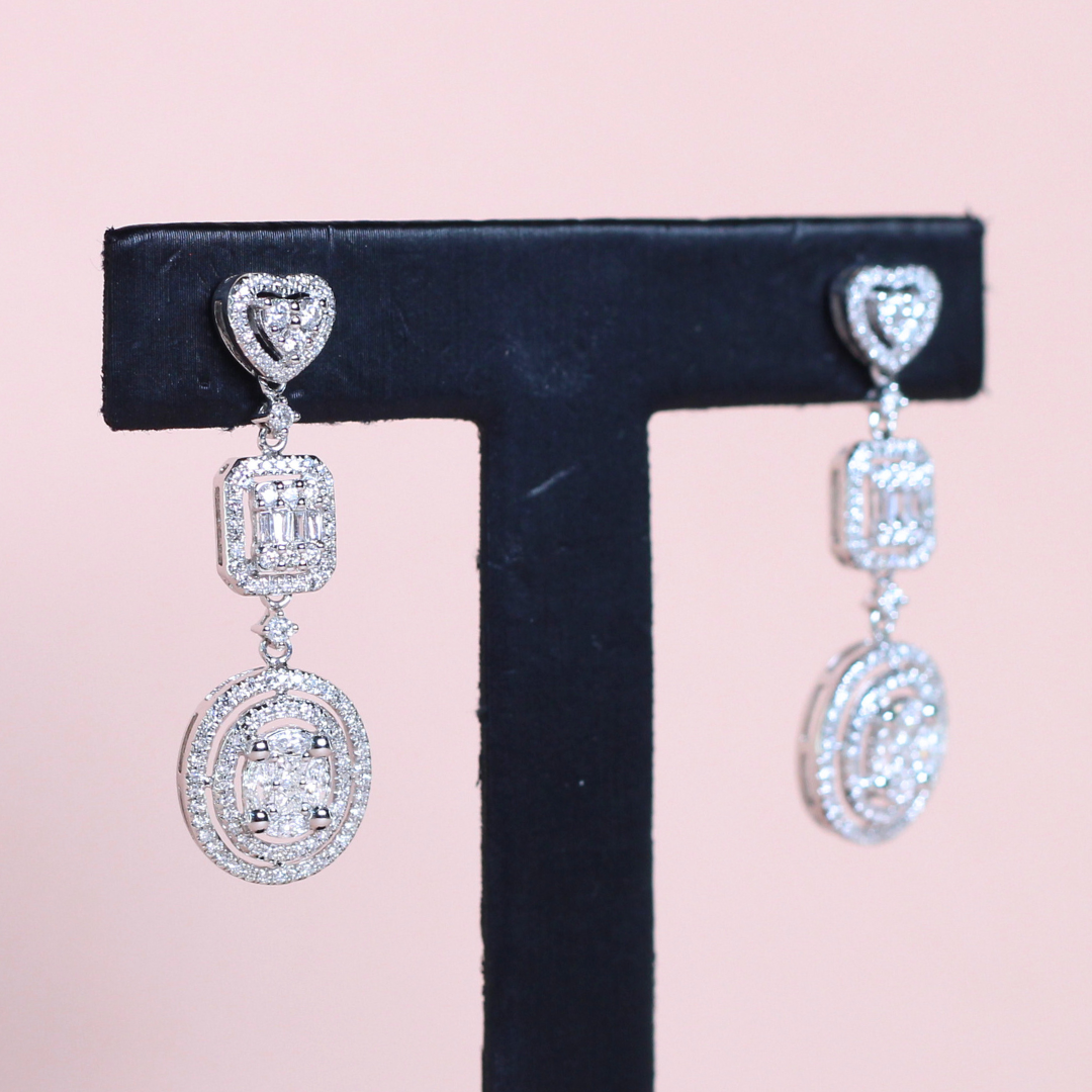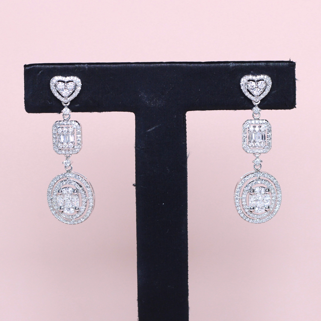 A captivating blend of brilliance and movement, these dangling earrings showcase a 1.75-carat multi-shape illusion design that creates the look of larger, dazzling diamonds. Crafted with a delicate drop silhouette, each earring sparkles with carefully set stones in varying shapes that reflect light from every angle. Elegant yet versatile, they’re the perfect pair to elevate your style.
