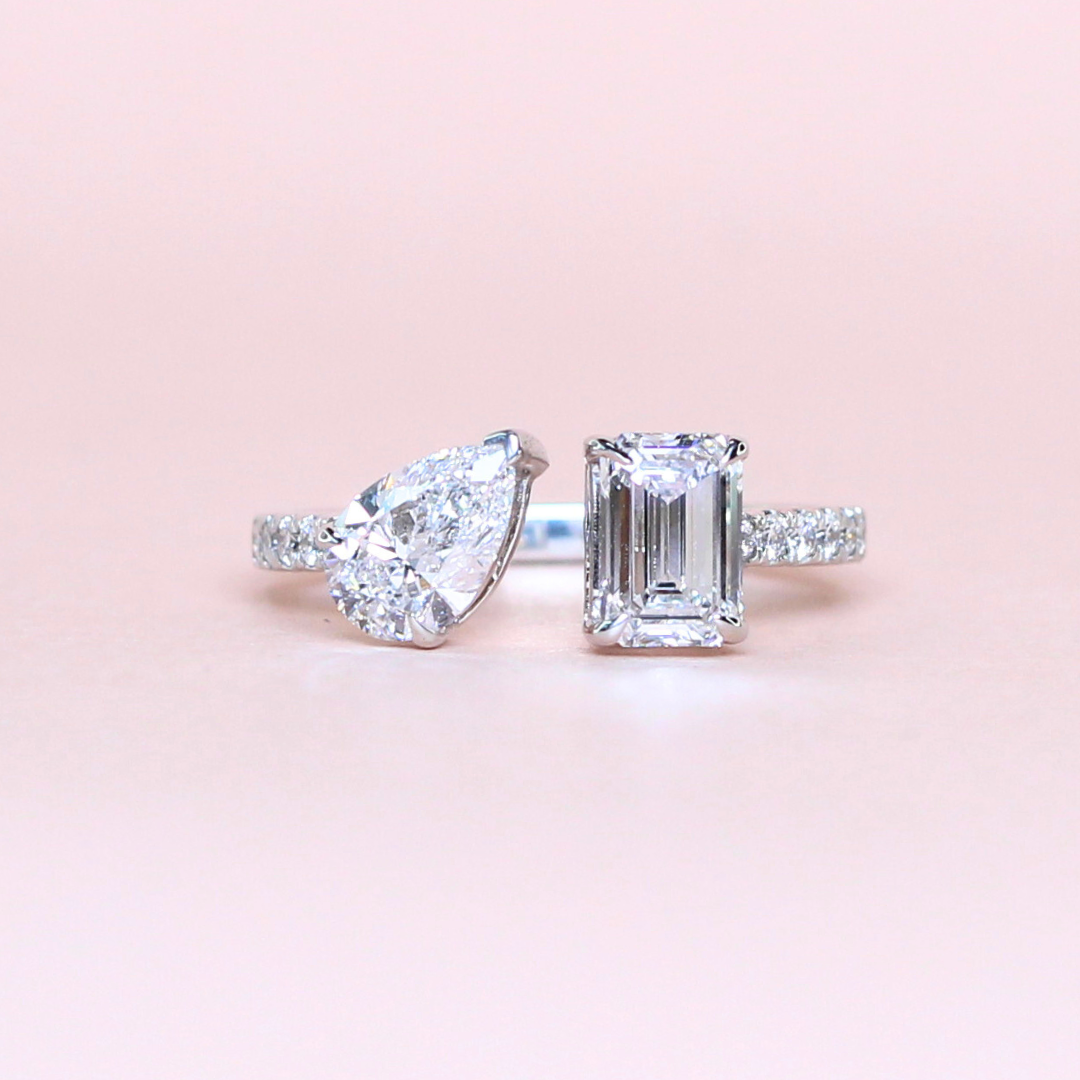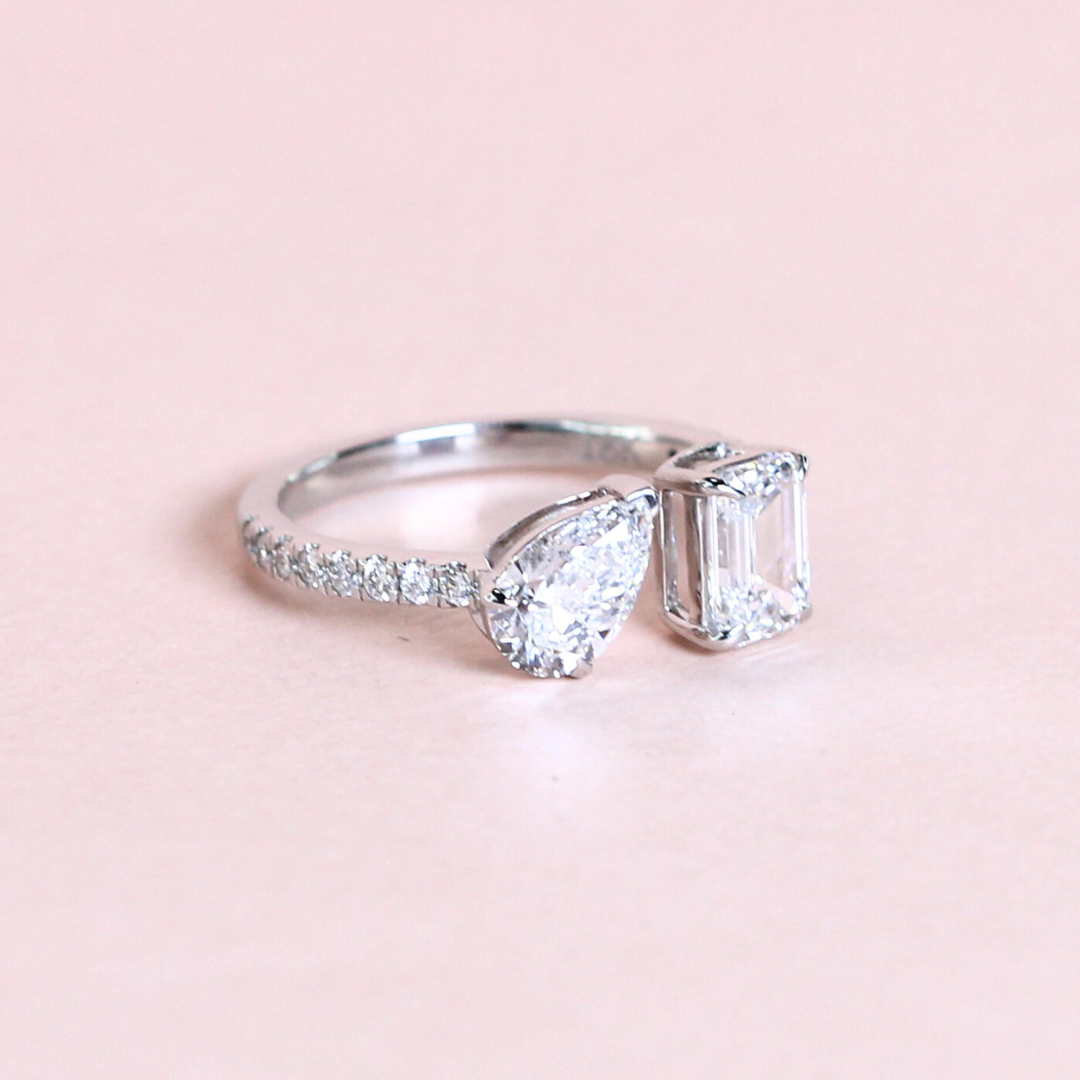 A graceful union of contrasts, this 1.80 carat Toi et Moi ring features an exquisite pairing of an emerald cut and a pear cut diamond—symbolizing two unique souls intertwined in harmony. The sleek, linear elegance of the emerald cut complements the romantic curves of the pear cut, set in a fluid bypass design that wraps the finger with effortless sophistication.