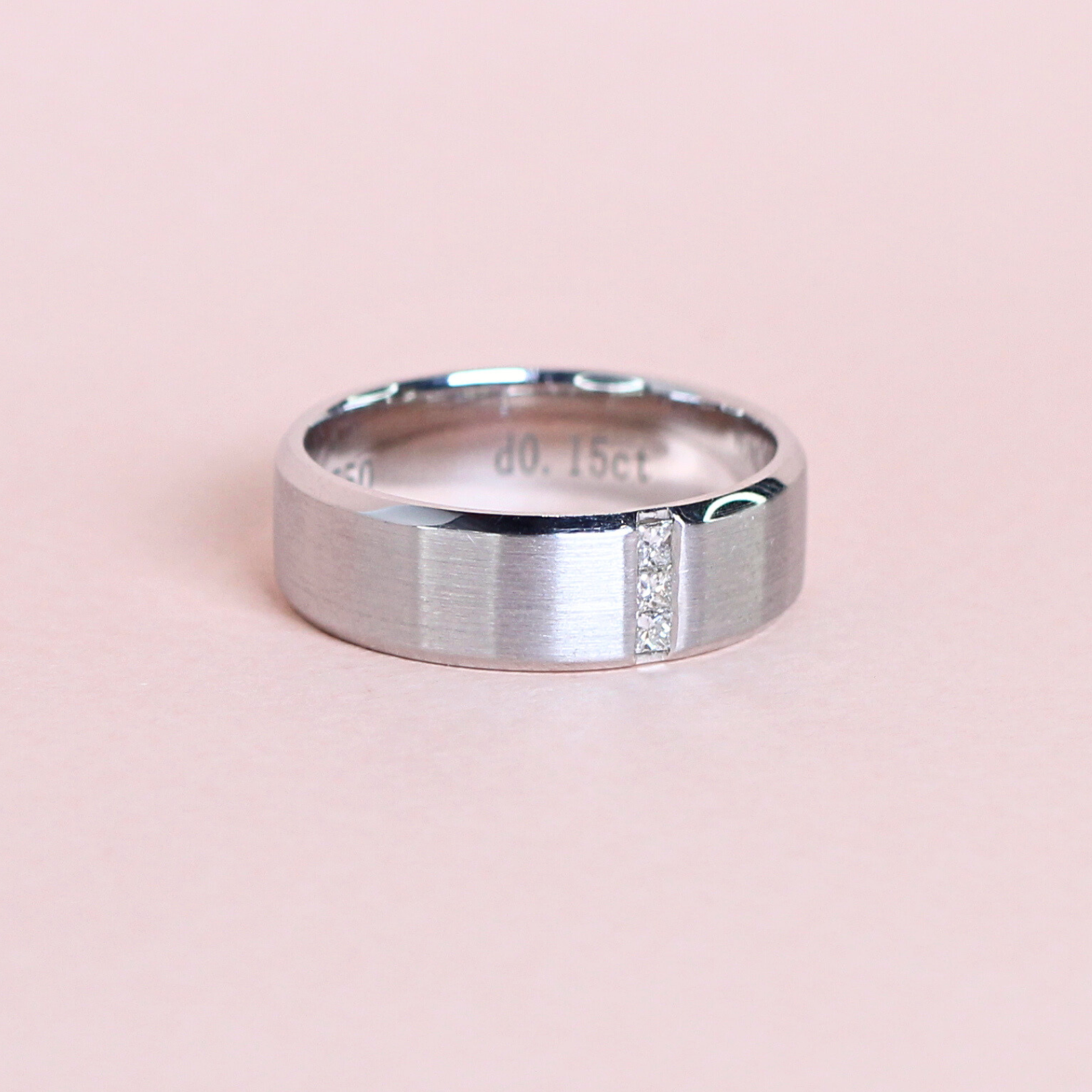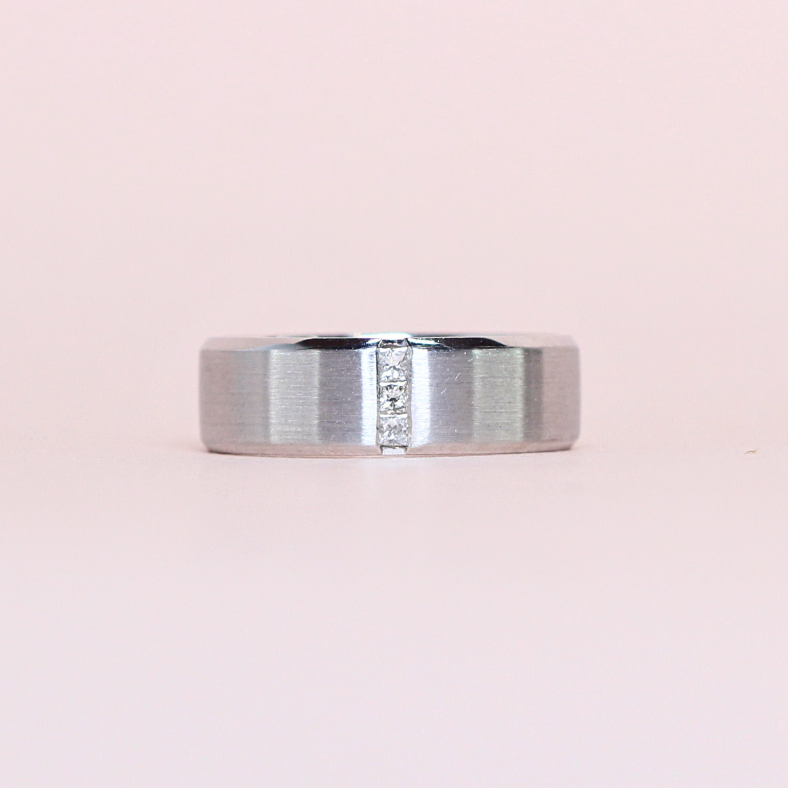 A touch of sparkle for grooms that shine. Adorned with three princess cut diamonds to give your wedding ring a special touch.