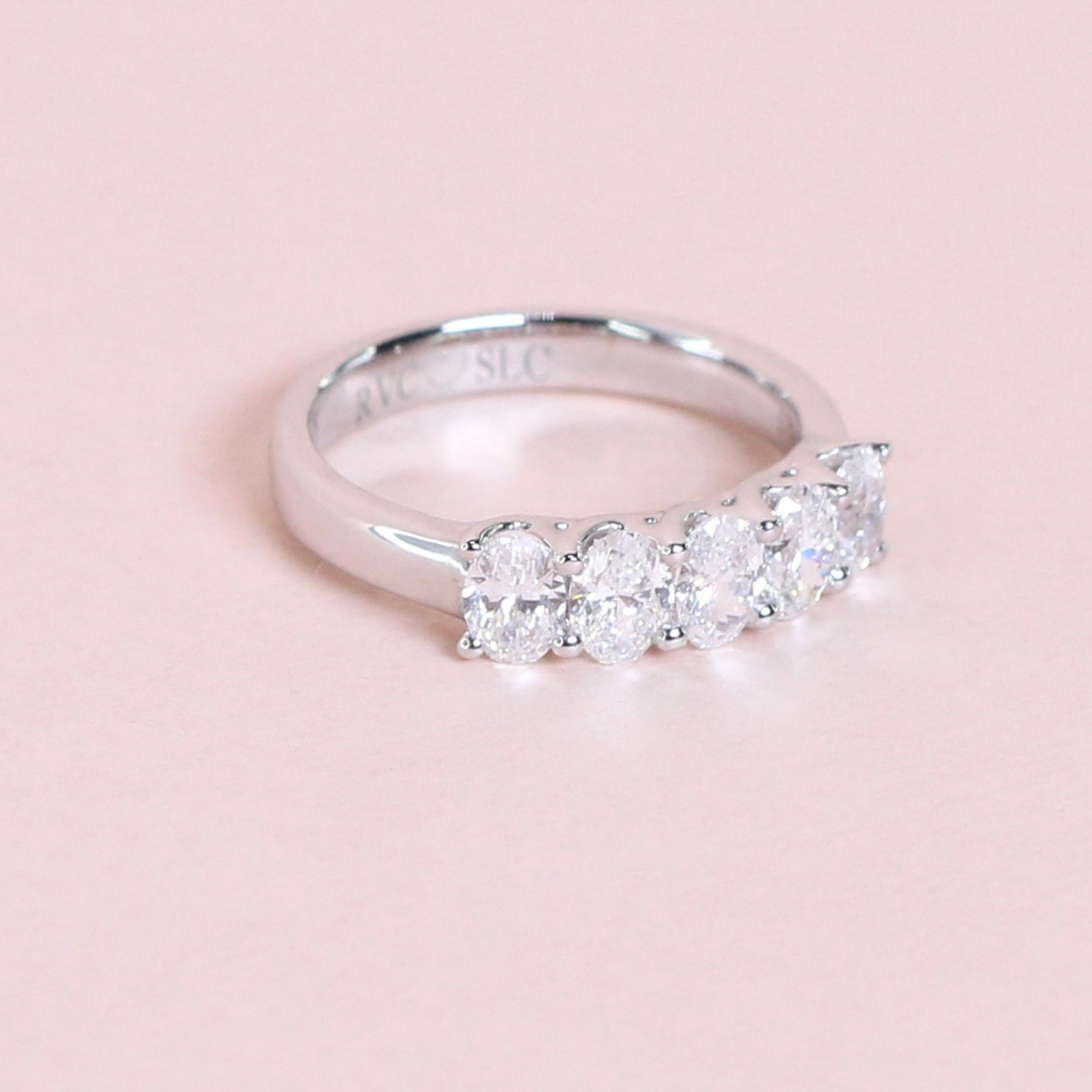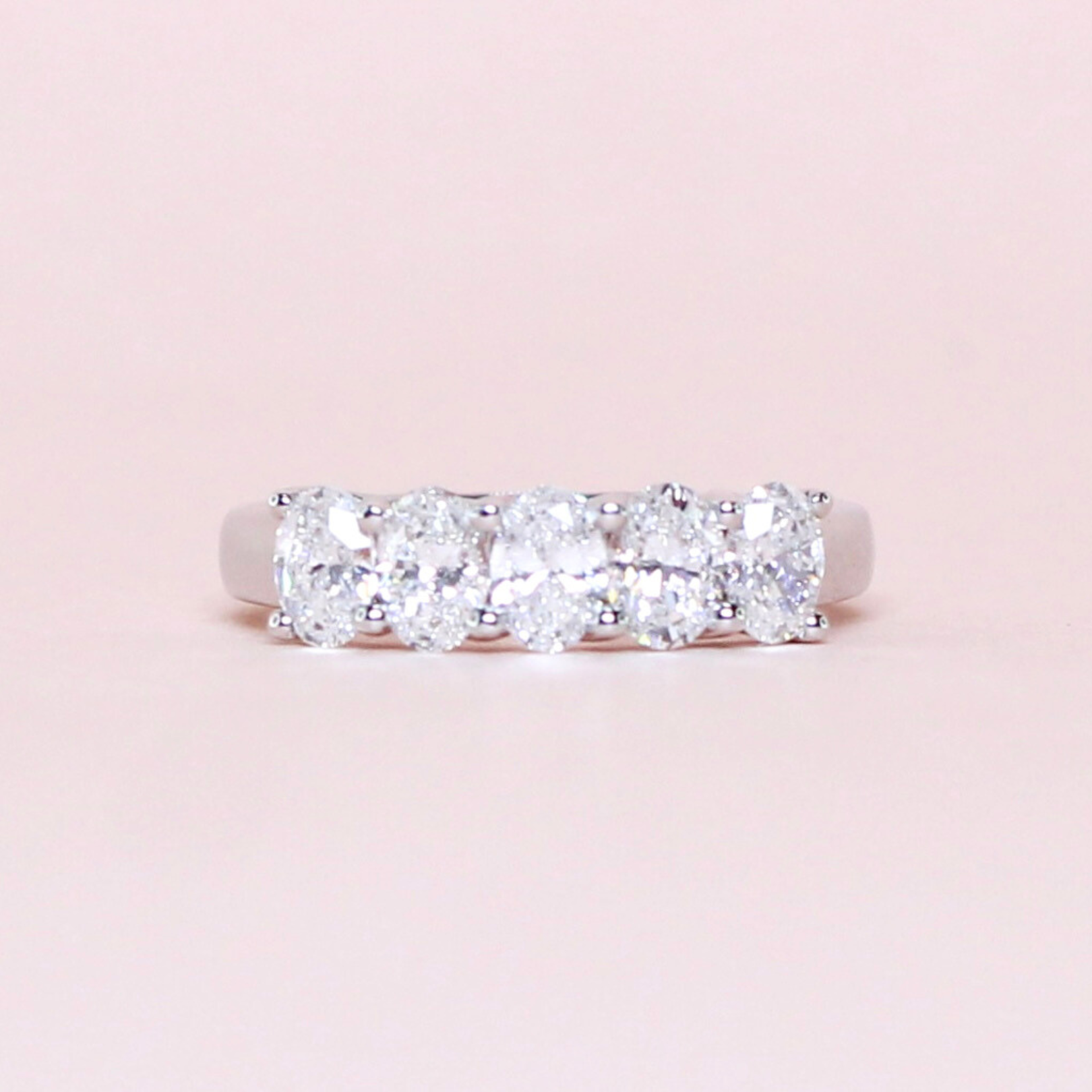 A stunning symbol of everlasting love and commitment. Crafted with meticulous attention to detail, this ring features five exquisite oval-cut diamonds that are carefully selected for its exceptional brilliance and clarity, creating a captivating display of light and sparkle.