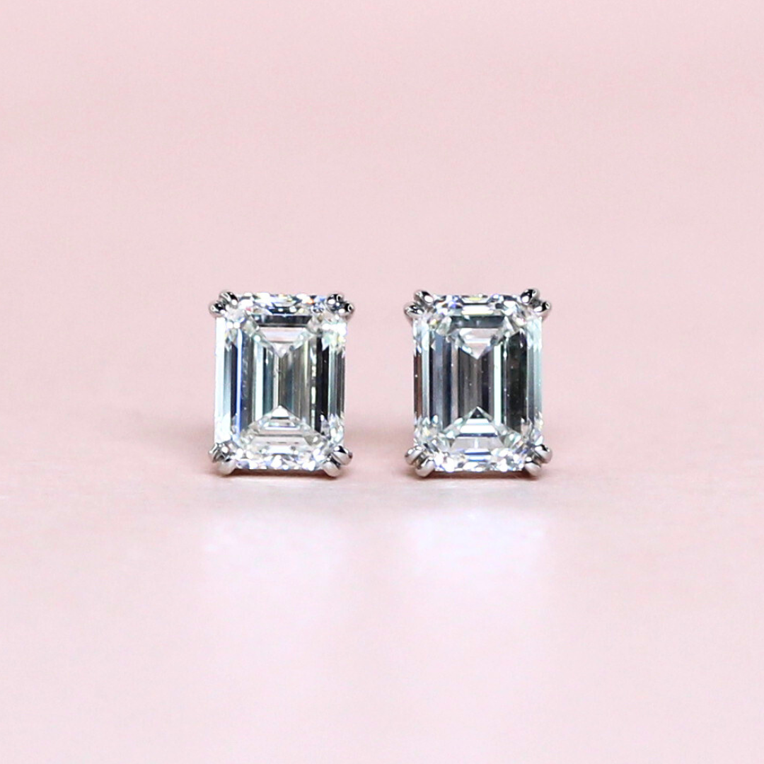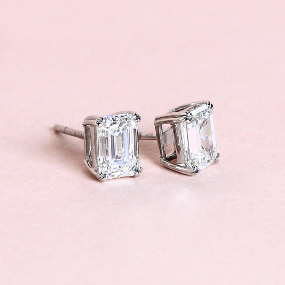 These stud earrings feature a total of 2.03 carats of emerald-cut diamonds, celebrated for their clean lines and mirror-like facets. Set in a classic four-prong setting, the elegant silhouette offers a timeless appeal—perfect for everyday sophistication or special occasion sparkle. A striking choice for those who appreciate understated luxury.