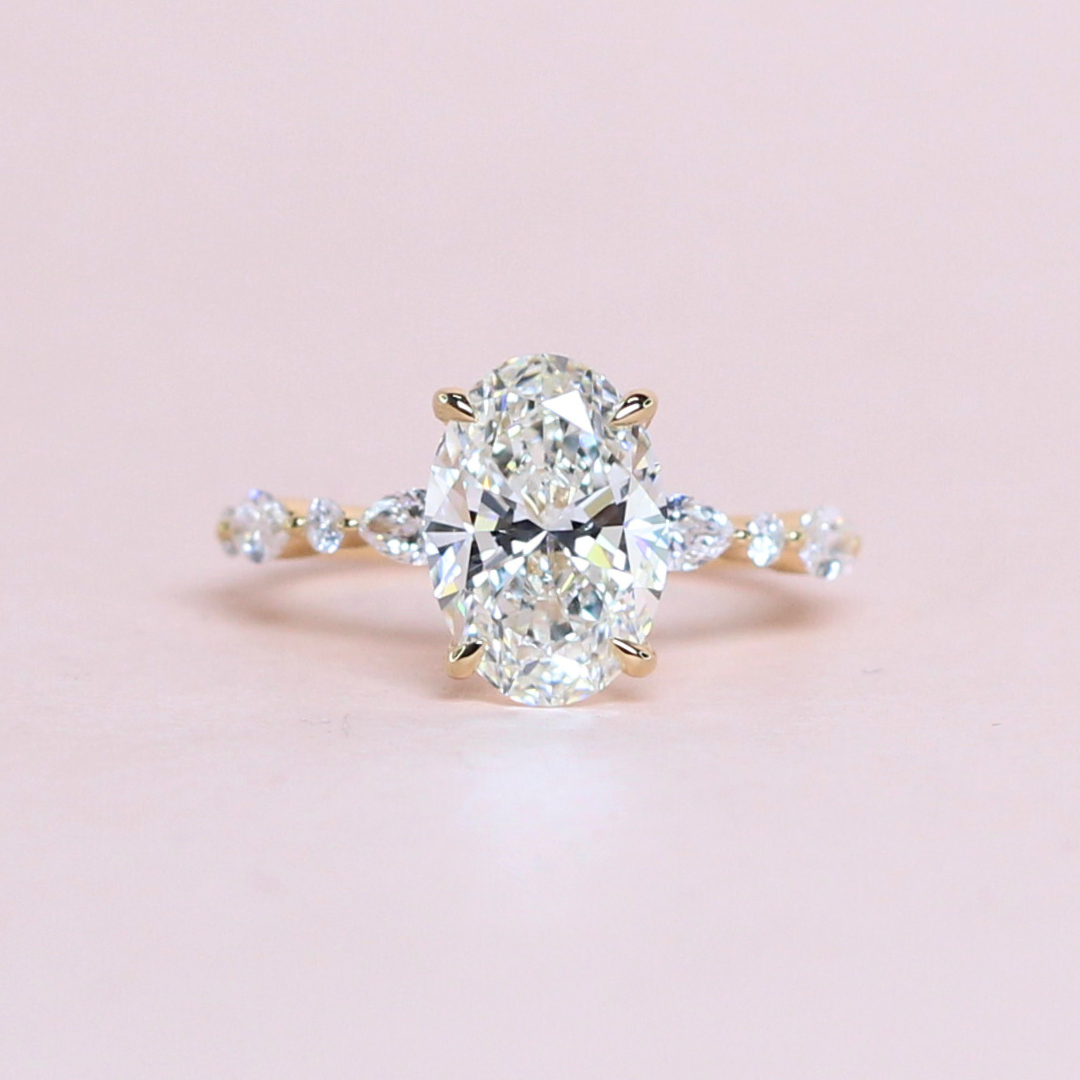 The Foix ring showcases a breathtaking 2.12ct oval lab-grown center stone, complemented by .25ct accent stones for added brilliance. A stunning blend of elegance and modern sophistication.