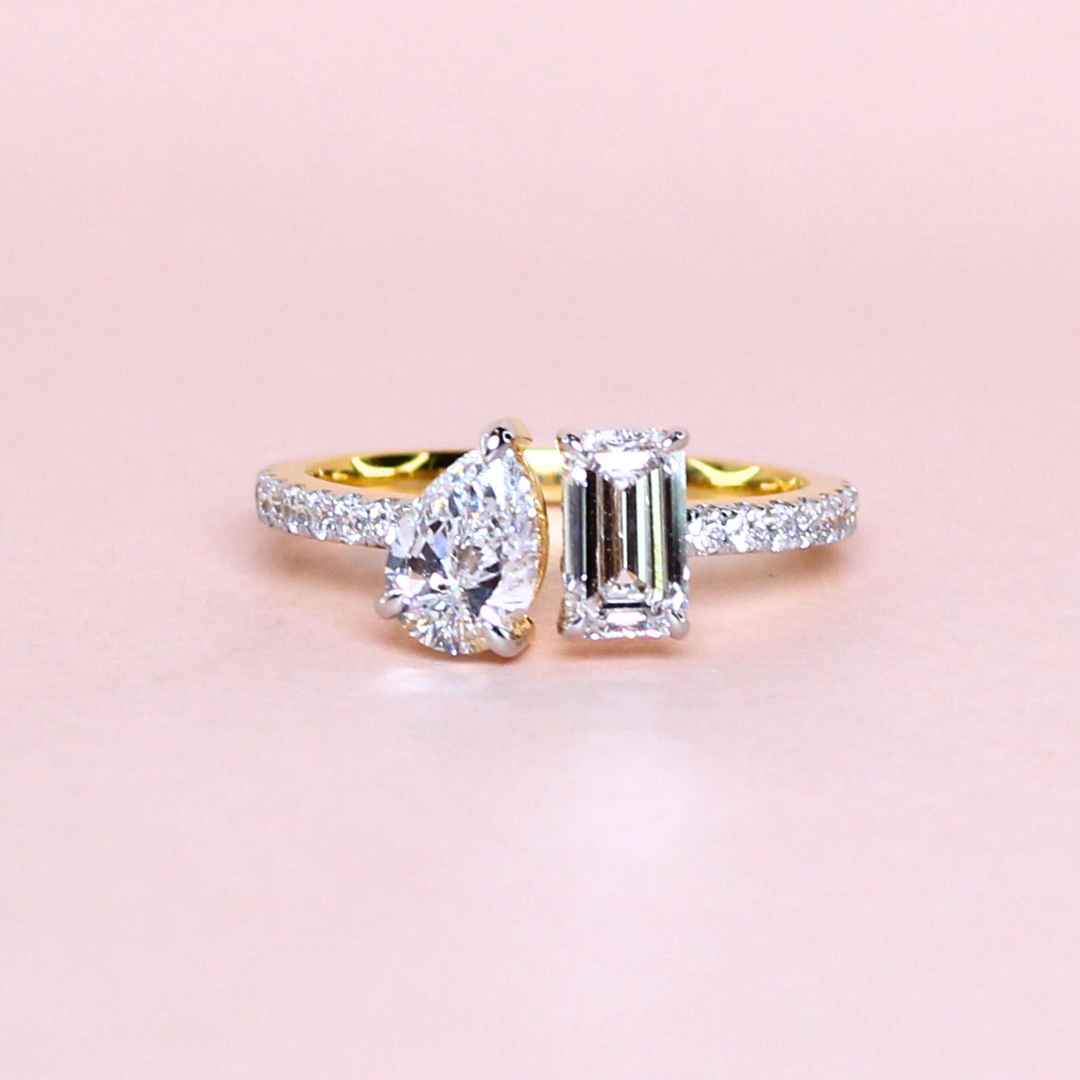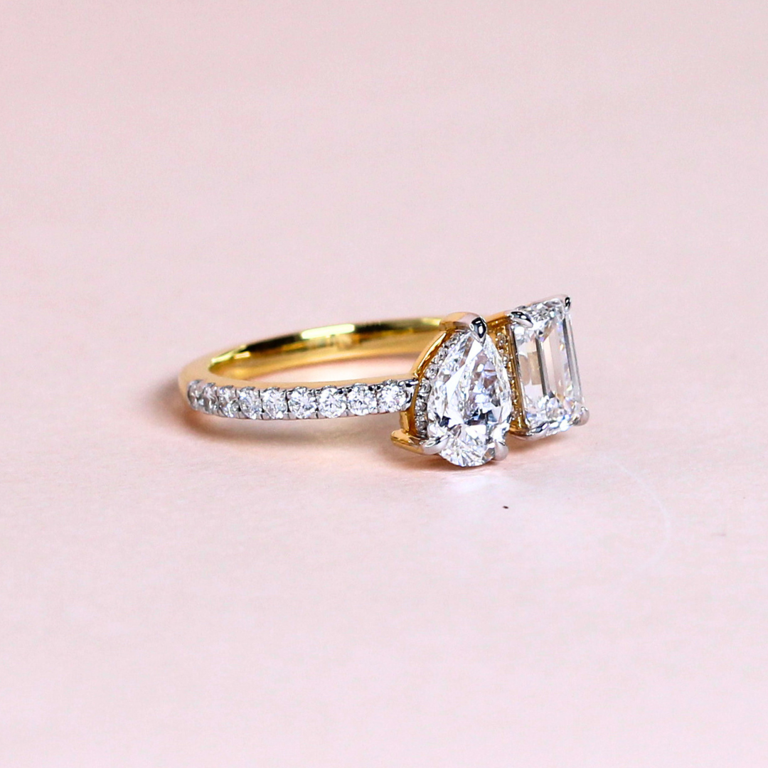 This 2.23-carat lab-grown Toi et Moi ring features a captivating pairing of a pear and emerald lab-grown diamonds, artfully set to symbolize two souls intertwined. The graceful bypass design is elevated by a hidden halo beneath each center stone, adding a touch of brilliance that subtly enhances the sparkle without overwhelming the design.