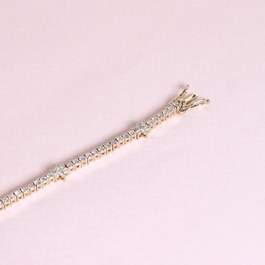 The Rositas tennis bracelet features a classic and delicate design, characterized by a continuous line of small, round-cut stones, each meticulously set in a graceful and flowing pattern with a subtle floral or circular motif, adding a touch of femininity and charm to the traditional tennis bracelet style.