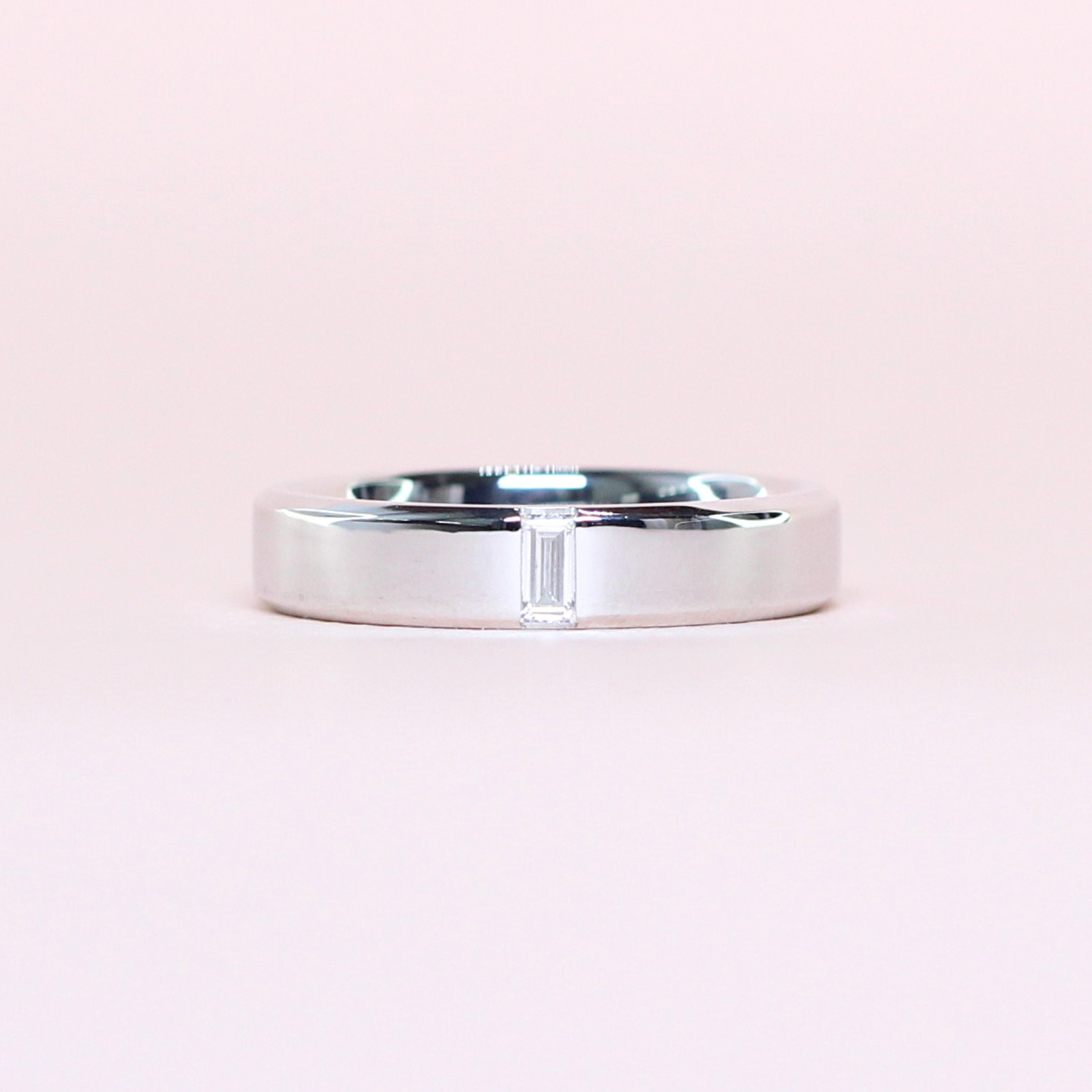 Exude understated elegance and refined sophistication with this ring featuring a vertically placed .20ct baguette diamond. This distinctive ring combines modern design with timeless appeal, making it a perfect symbol of enduring love and commitment.