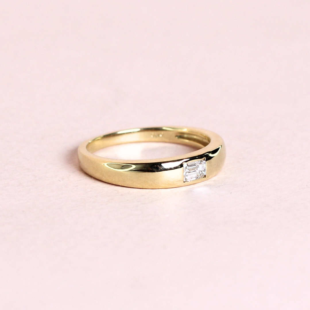 A refined .20ct emerald-cut ring with clean lines and a crisp, open design that highlights the stone’s natural clarity and modern character.