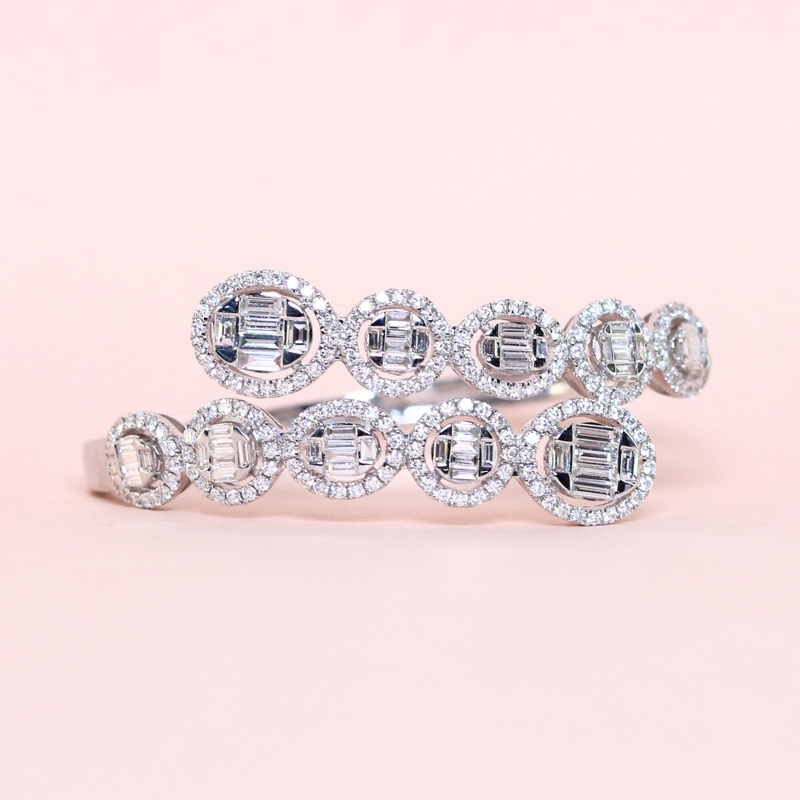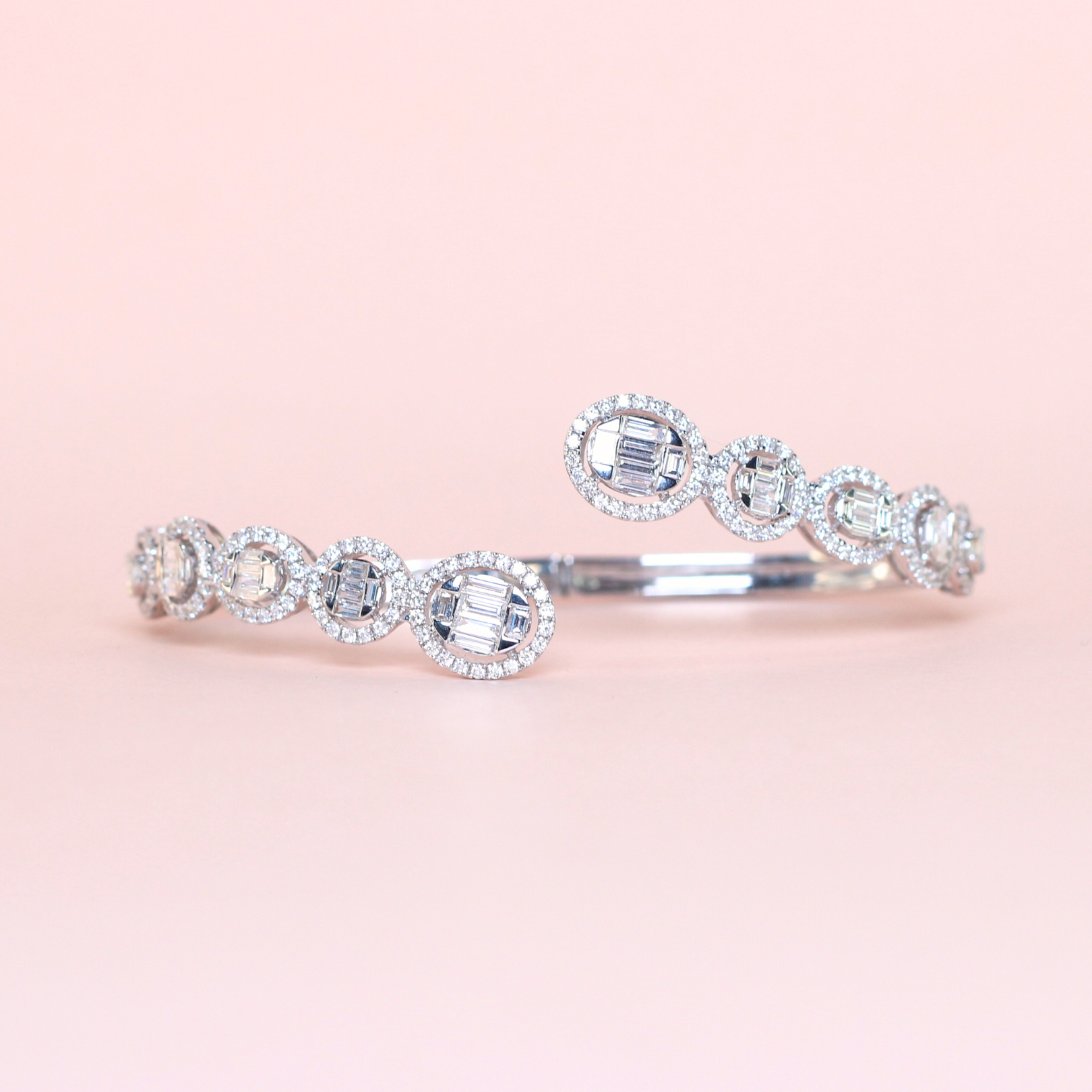 This statement bangle commands attention with its exquisite craftsmanship and dazzling gemstones. The focal point of the design is a breathtaking array of diamonds, meticulously arranged to create a captivating pattern.