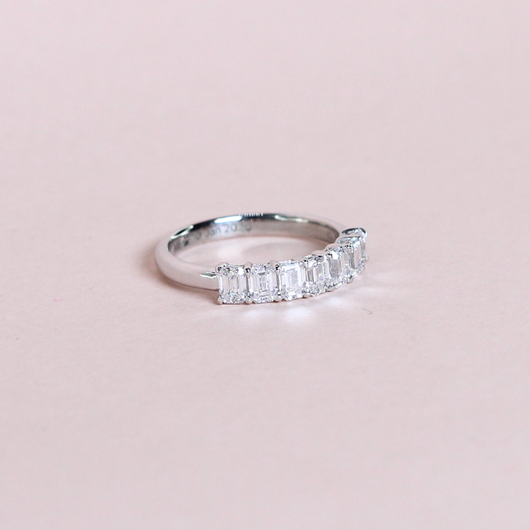 A 0.84-carat 7-Stone Emerald Ring features seven emerald-cut diamonds set in a sleek, elegant design. The emerald cut, known for its step-cut facets and hall-of-mirrors effect, offers a sophisticated, understated brilliance.