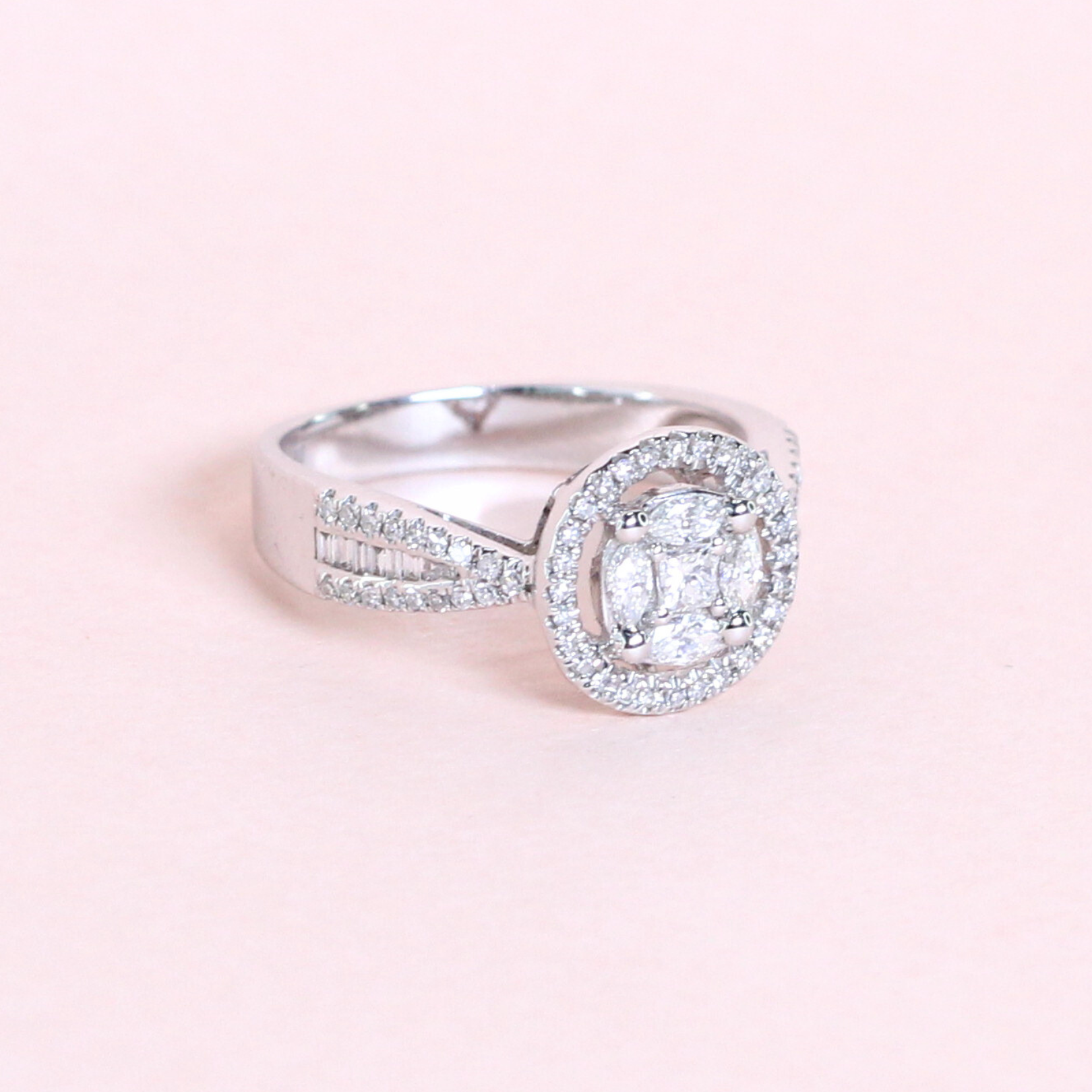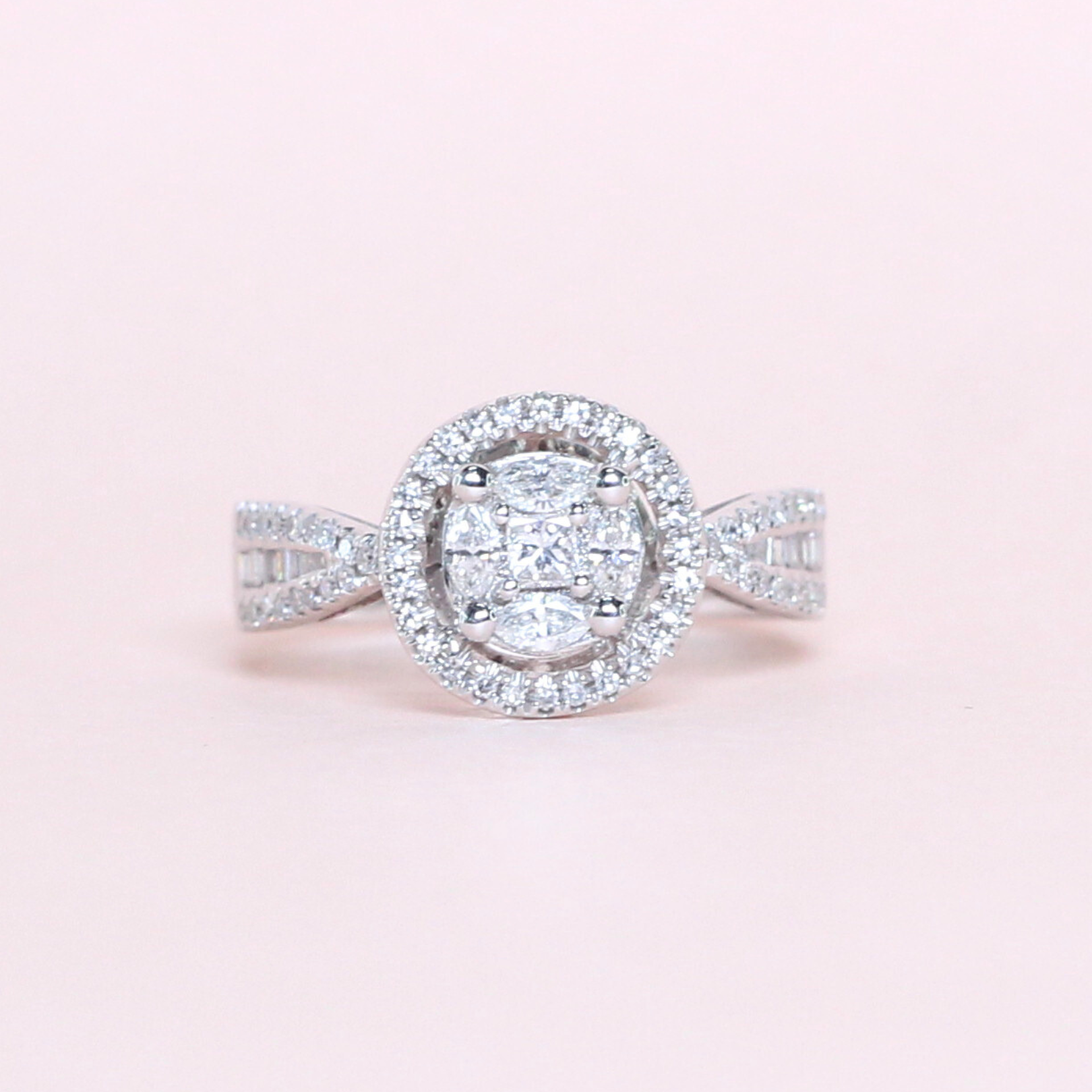 This .90 carat round illusion ring with a halo style is designed to maximize the visual impact of the center stone while providing a luxurious and timeless appeal. The combination of the illusion setting and the halo of diamonds ensures that the ring sparkles brilliantly from every angle, making it a stunning choice for any special occasion.