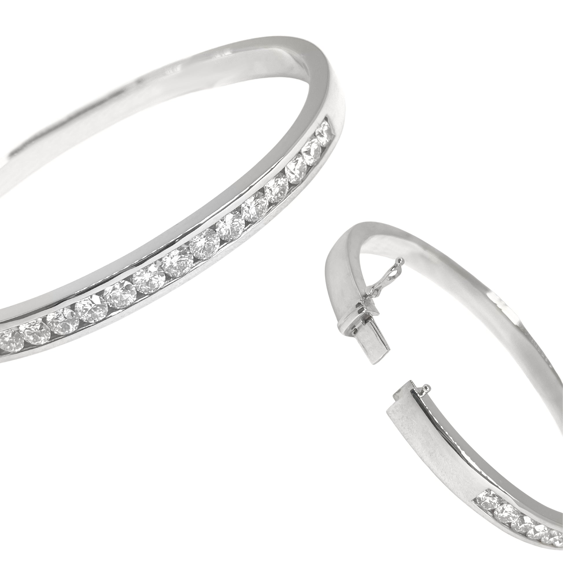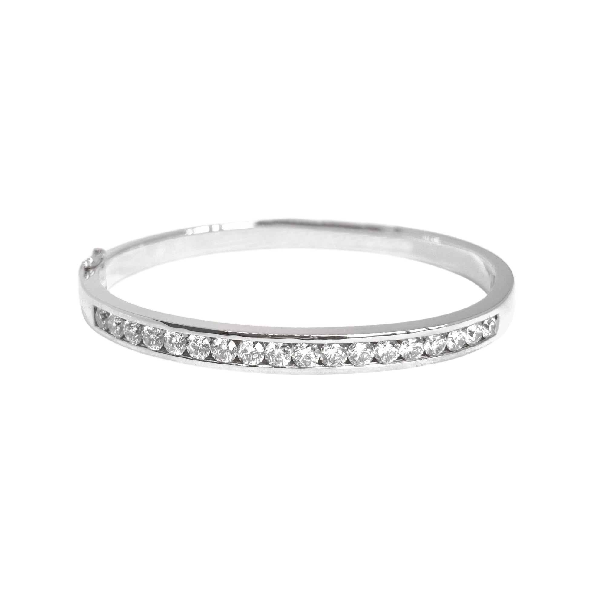 Showcasing round brilliant diamonds, this half tennis bangle is perfect for stacking or as a solo piece.