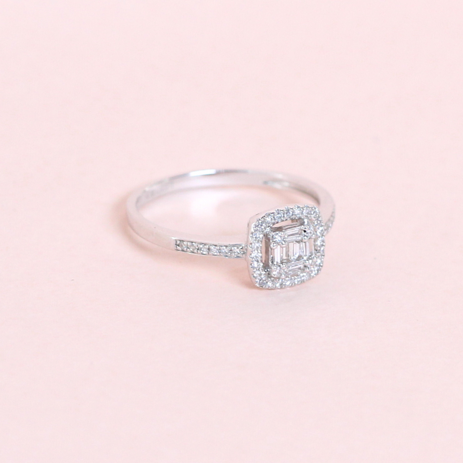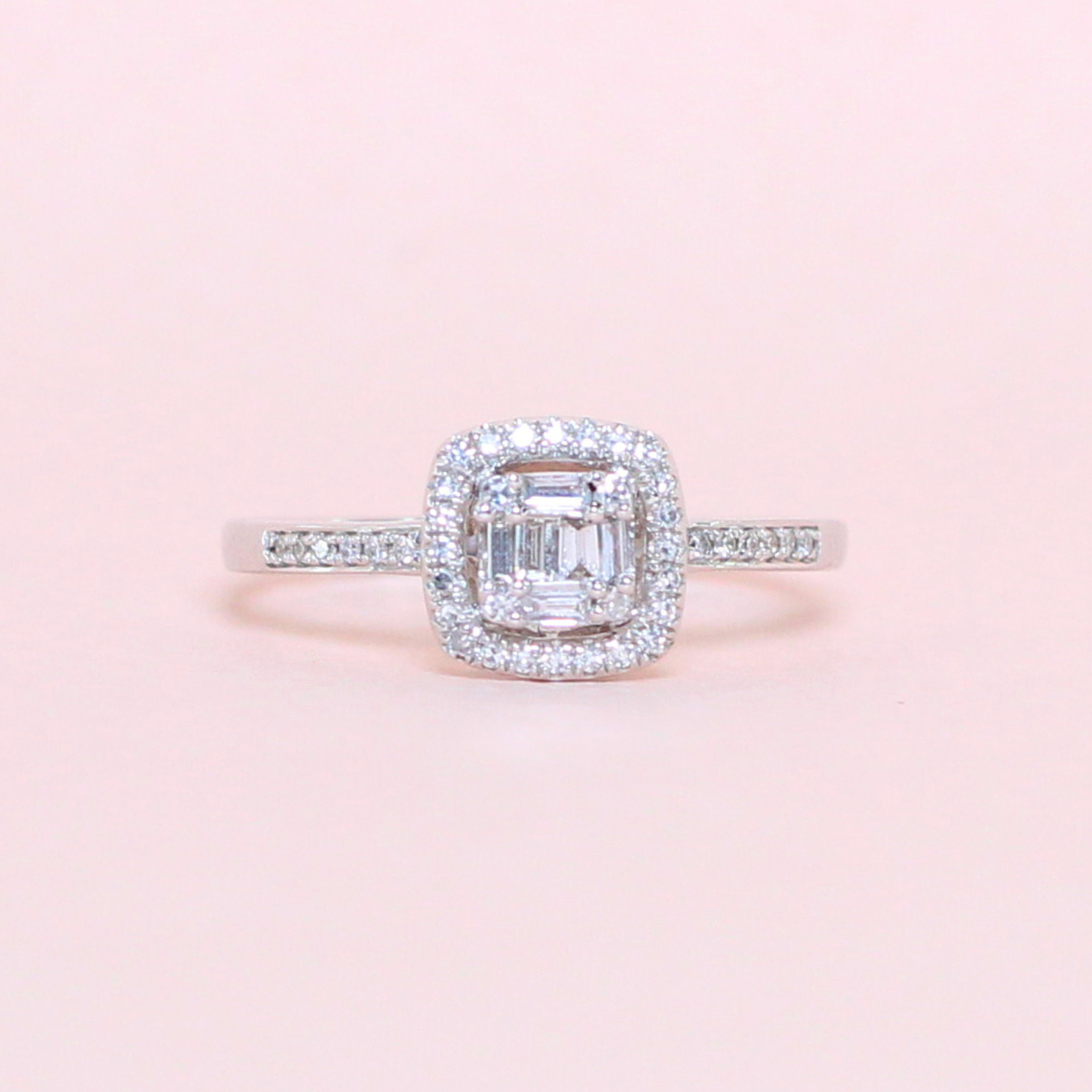 Our cushion illusion diamond ring features a central cluster of diamonds arranged in a cushion-shaped formation. The illusion setting is meticulously crafted to enhance the size and brilliance of each diamond, creating a stunning visual effect reminiscent of a larger, single stone.