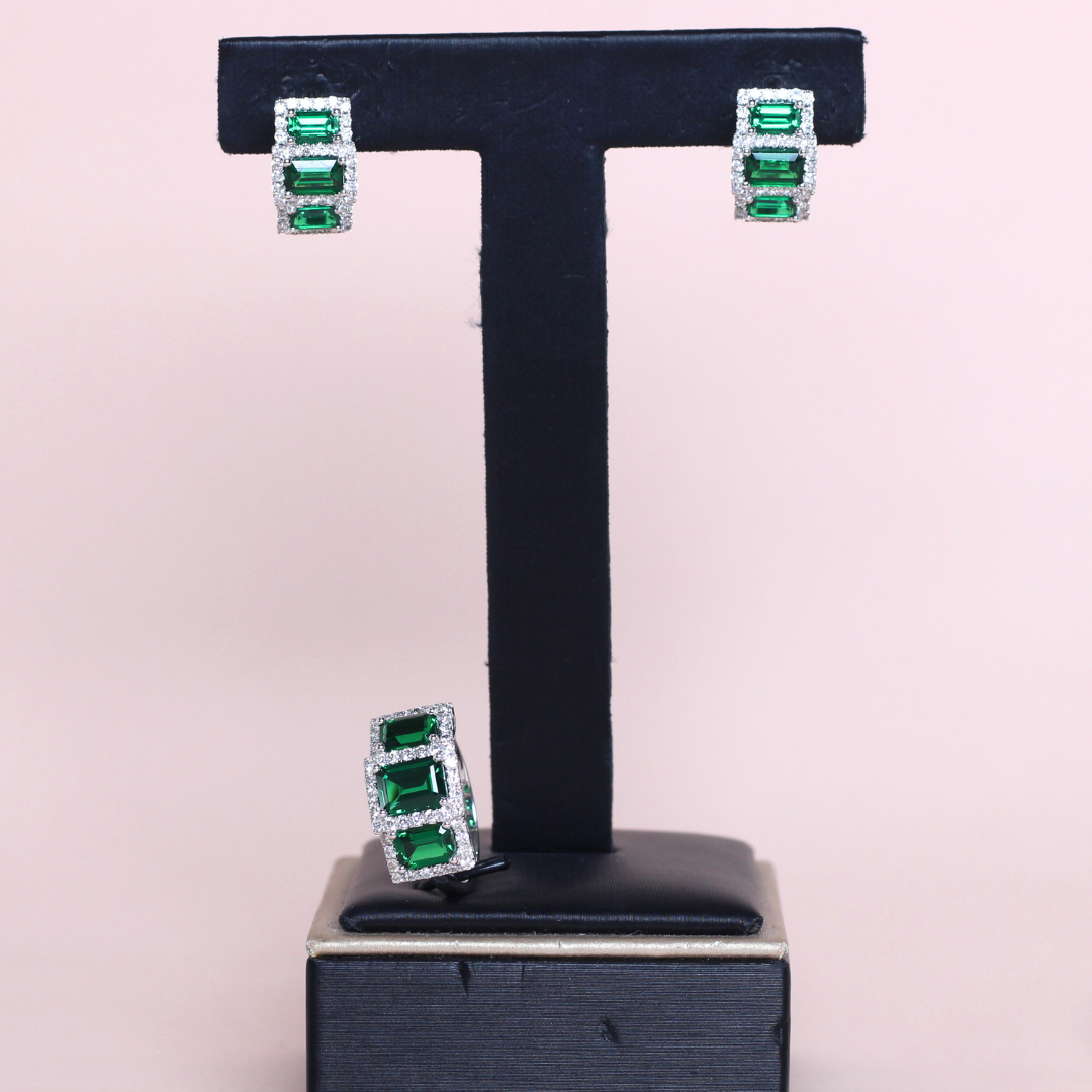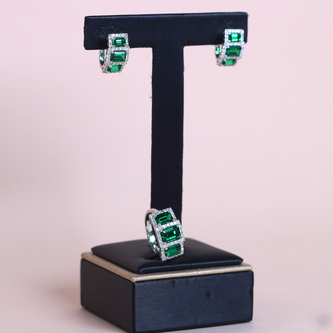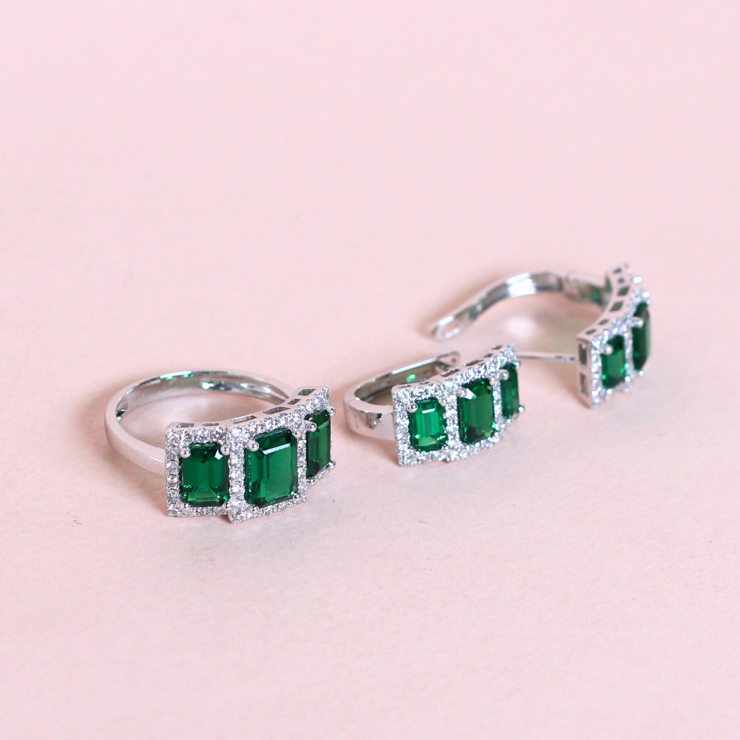 An elegant set showcasing 5.48ct of vivid emeralds paired with .80ct of sparkling diamonds, blending rich color with refined brilliance.