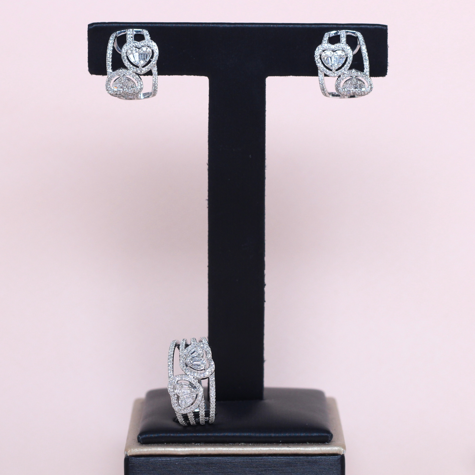 This exquisite jewelry set features the enchanting beauty of heart-shaped diamonds enhanced by an illusion setting, perfectly arranged in elegant half hoops making it a masterpiece of romantic elegance and modern sophistication.