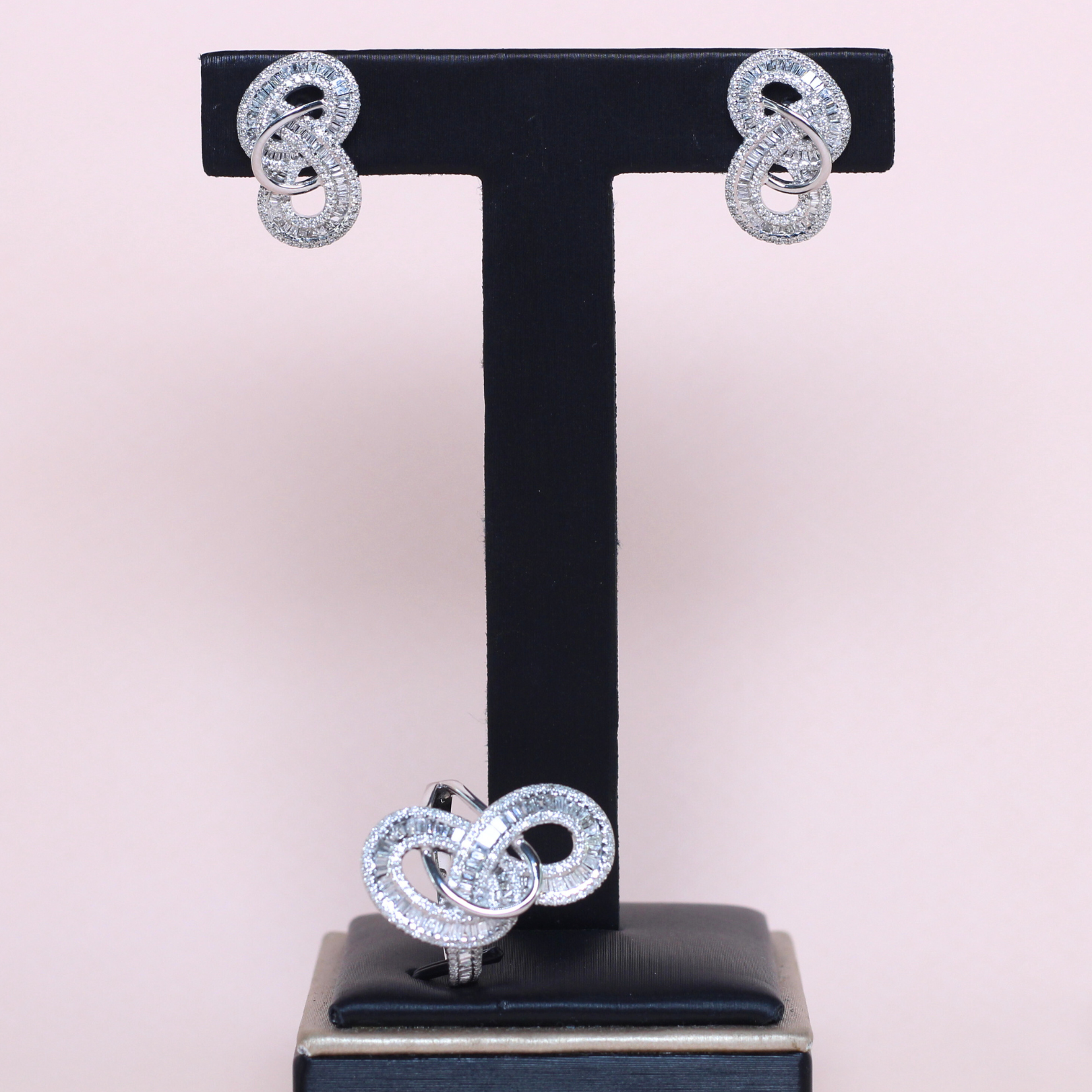 Perfect for adding a touch of luxury and symbolism to any outfit, this set is designed to captivate. The infinity motif, enhanced by the dazzling brilliance of the baguette diamonds and the illusion setting represents endless love and timeless elegance.