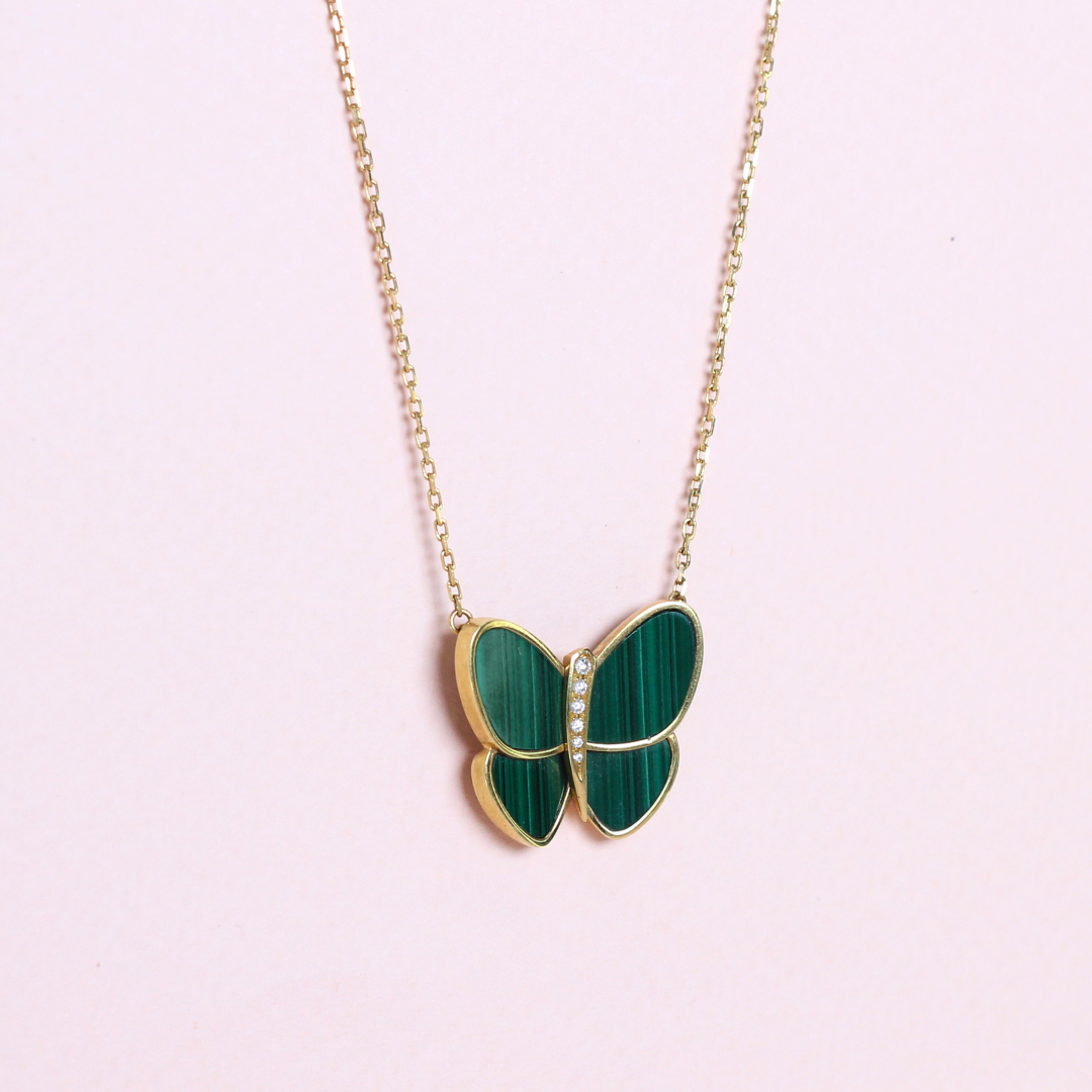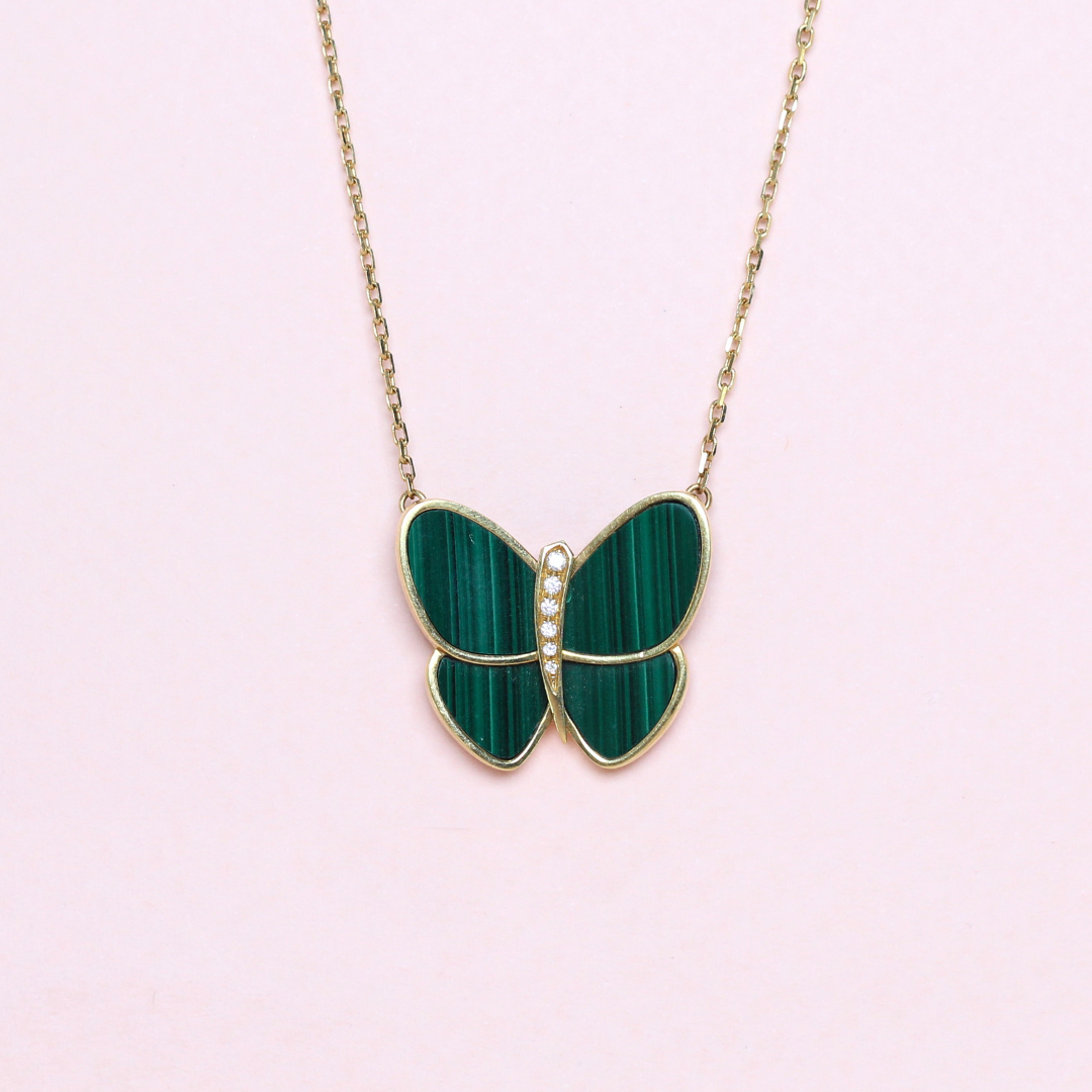 This elegant necklace features a butterfly pendant crafted with rich malachite gemstone inlays, showcasing deep green hues with natural banding unique to malachite. The butterfly's body is accentuated by a sleek gold-tone design, seamlessly complementing the gemstone's vibrant beauty. The pendant is encased in gold-tone metal and paired with a minimalist chain, offering a timeless and sophisticated touch.