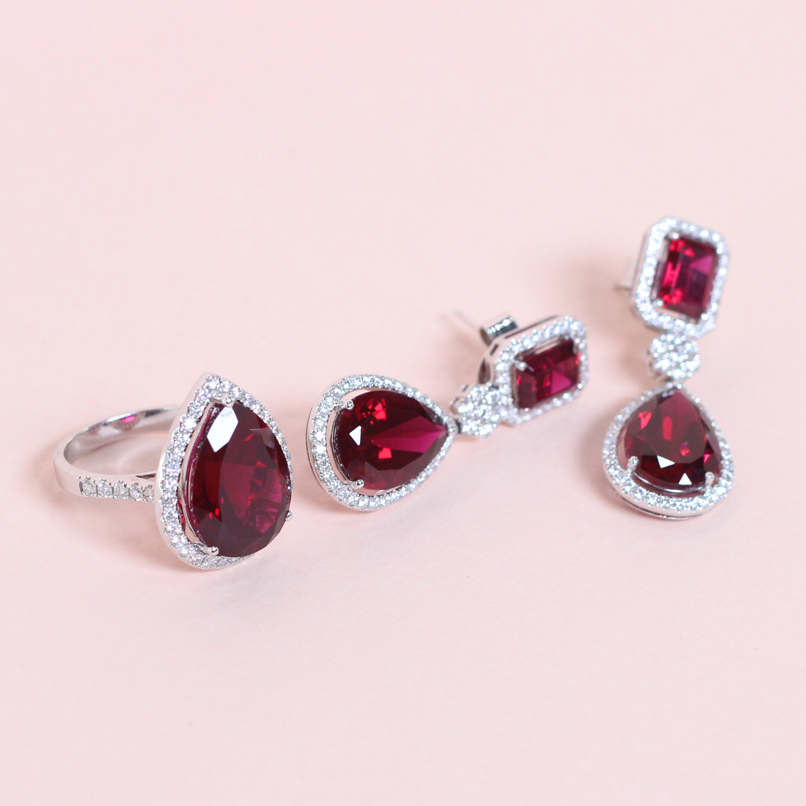 This stuning ruby jewelry set is designed to highlight the natural allure and fiery brilliance of rubies. Each piece is adorned with stunning rubies, complemented by diamonds, creating a harmonious blend of color and sparkle.