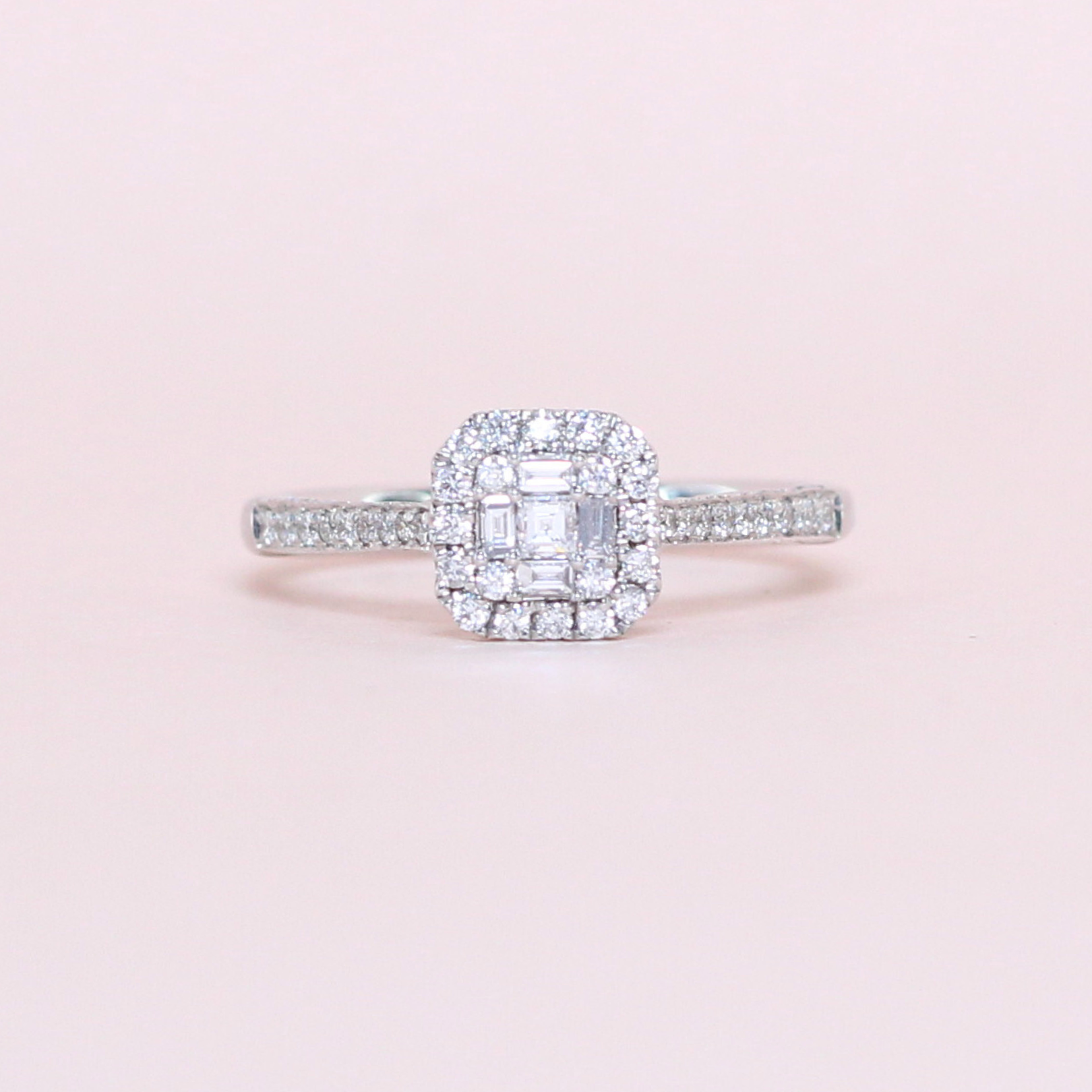 This square diamond cluster illusion setting create a piece that is both modern and timeless, sparkling with every movement.