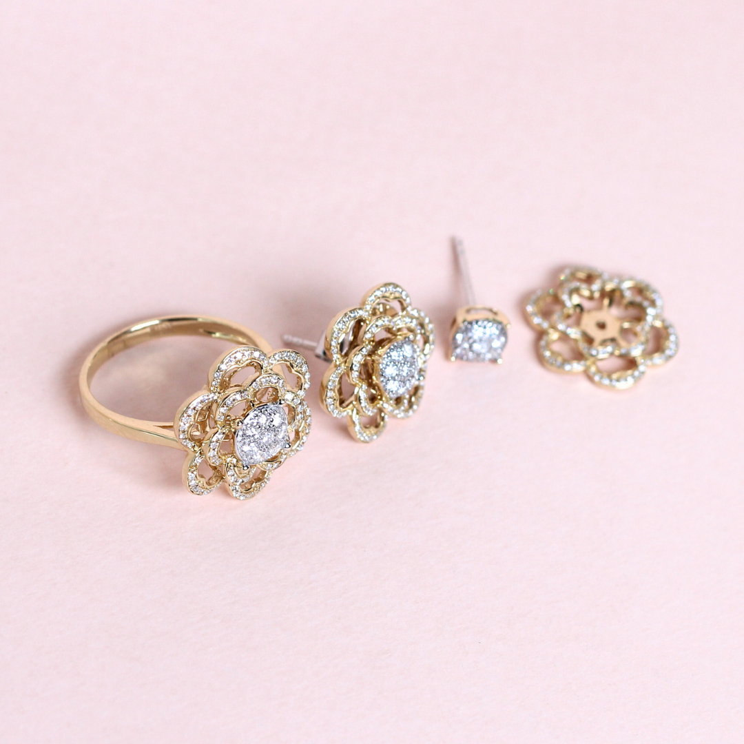 The Flower Diamond Illusion Set is characterized by its intricate floral motif, where diamonds are arranged to resemble blooming flowers. The design incorporates multiple petals, each crafted with precision to create a three-dimensional effect. The illusion setting enhances the visual impact, making each piece appear larger and more radiant than it actually is.